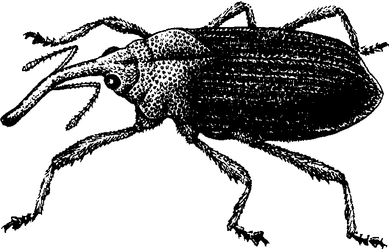 甘薯长足象甲 福建北部年生2代为主,南部3代或2年5代。以成虫在岩石、土缝、树皮隙缝或在越冬薯及薯田附近的野牵牛等植物上越冬,少数末龄幼虫,也可以在冬薯的虫瘿或冬薯藤内越冬。福建北部越冬成虫4月上旬开始活动,5月中下旬产卵,6月上旬至7月下旬为幼虫期。2代幼虫出现在7月下旬至9月中旬,8月下旬至9月中旬化蛹。羽化后成虫在虫瘿内停留一两天后外出,善爬,不善飞,具假死性。交配后即产卵,大多产在薯蔓近节处。幼虫孵化后蛀入茎部取食,被害部受刺激后形成虫瘿,影响水分和养料输送,成长幼虫即在瘿内化蛹。凡冬春温暖,夜晚气温多数在0℃以上的地区,越冬成虫存活率高,如发生期中少雨干旱,更有利其滋生繁殖、猖獗为害。春季清除遗株、残薯及野牵牛、砂藤等野生植物,可消灭大量越冬虫源;5~6月间可在新插薯田或苗床捕杀成虫。成虫盛发期可喷施敌敌畏、敌百虫等。 甘薯长足象甲sweet potato gall weevilAlcidodeswaltoni (Boheman),又称甘薯大象虫。昆虫纲,鞘翅目,象虫科。分布于华南、华东(含台湾)、西南;日本,越南,缅甸,斯里兰卡也有分布。寄主有甘薯、蕹菜、月光花等旋花科植物。成虫体长7.5~9.0 mm,长椭圆形,黑色发光,体表散布颗粒,被覆黄白、灰褐、红褐色毛状或粉状鳞片;头小,喙管状略弯;前胸背板前狭后宽,中间有一纵纹,后缘两侧深凹;鞘翅自基部向端部收狭,第3、第8隆线及第5纵沟具白色鳞片条纹。末龄幼虫体长14.5~16.5 mm,头红褐色,胸腹部乳白色;体肥壮,前小后大,向腹面弯曲;胸足退化成小突起。一年发生1~3代,以成虫越冬,也有以末龄幼虫在薯块内越冬。成虫咬食甘薯嫩梢、嫩茎和叶柄成纵沟,在茎蔓或叶柄上咬孔产卵,每孔一粒。幼虫蛀食叶柄和茎蔓形成虫瘿,也有向下蛀食薯块,老熟后在为害部化蛹。可采用清洁田园;诱杀成虫;用药液浸苗或喷雾等防治措施。 |