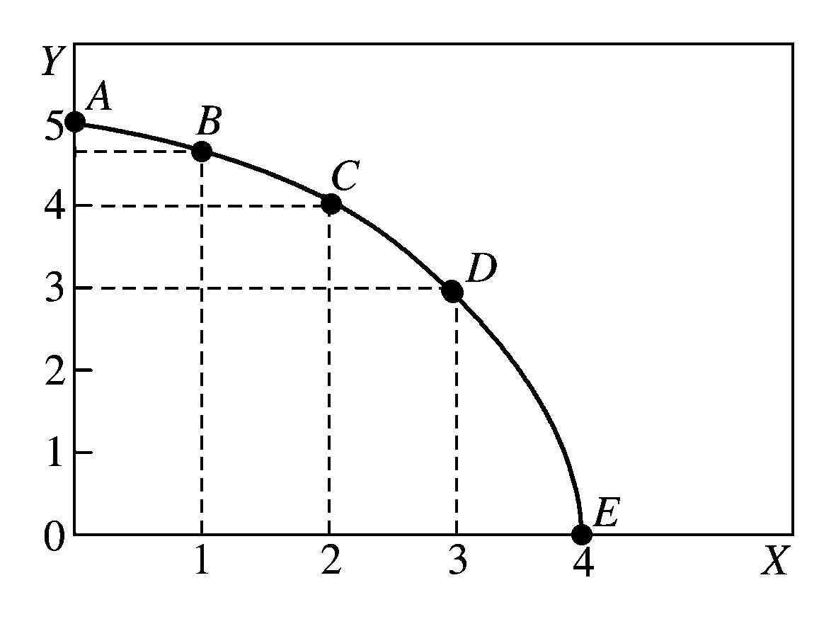 生产可能性边界又称“生产可能性曲线”。以既定的生产要素的投入所能有效率地生产出来的各种产品的不同组合。以两种产品——服装(以X代表)和布料(以Y代表)为例。图中以横轴表示服装的产量,纵轴表示布料的产量。假设所需投入要素的量——劳动和资本是既定的,即在一定量的劳动和资本投入的情况下,既能生产一定量的布料,又能生产一定量的服装,ABCDE曲线就是生产可能性边界。在A点,全部投入要素只用于生产布料,可生产出5单位布料。从A点到B点时,为了增加1单位服装的生产,需要减少1/3单位布料的生产;从B点到C点时,为了再增加1单位服装的生产,需要再减少2/3单位布料的生产;从C点到D点时,为了再增加1单位服装的生产,需要再减少1单位布料的生产;从D点到E点时,为了再增加1单位服装的生产,需要再减少3单位布料的生产,这时全部投入要素只用于生产4单位服装。生产可能性边界具有两个特点:(1) 它是向下倾斜的。这是因为在既定的投入要素下,要有效率地生产出更多的服装,就必须将投入要素从布料生产中转移出来,这将减少布料的生产。(2) 它是凹性的(凹向原点),即其斜率的绝对值随着服装产量的增加而增大。这个斜率的绝对值是服装对布料的边际转换率(以MRTXY代表)。边际转换率是指在既定的投入要素下,每新增一单位某种产品(如服装)的产量所要减少的另一种产品(如布料)的产量。图中,边际转换率在B点为1/3,在C点为2/3,在D点为1,在E点为3。在既定的投入要素下,为了多增加一种产品的生产,需要越来越多地减少另一种产品的生产。因为随着一种产品产量的扩大,其投入要素的边际产量递减,为了继续增加其产量,就需要占用更多的投入要素,使其生产的边际成本上升,从而更多地减少另一种产品的投入要素和产量。在生产可能性边界上的每一点,其边际转换率也等于一种产品生产的边际成本与另一种产品生产的边际成本的比率。以MCX代表服装生产的边际成本,以MCY代表布料生产的边际成本,则服装对布料的边际转换率可写为: MRTXY=MCX/MCY
