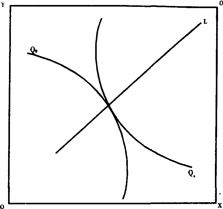 在资源约束的情况下,企业多种产品最优组合的原则的确定,需要借助盒形分析图 (如图H)。该图是由X、Y两种要素组合的,实际上是A、B两种产品等产量线坐标图组合而成,QA为A产品的等产量线,QB为B产品的等产量线,其切点便是A、B两种产品的最优组合。但该图平面上任一点都有两条 (QA和QB) 等产量线通过,这样就有无数个两种产品的最优组合点,这些接合点连接而成一条契约线L。契约线上任一点都表示两种产品的最优组合,这种组合有无数组解,一般称之为帕雷托优解。借助于数学手段,可以证明,两条等产量线相切时,MQAx/MQAy=MQBx/MQBy,即当两种投入要素对于A产品的边际产出率之比等于两种投入要素对于B产品的边际产出率之比时,两种产品便实现了最佳组合,或说得到了帕雷托最优。