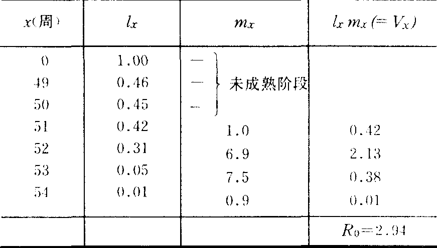 表2中的x、lx与表1相同,但lx仅代表存活的雌虫数。mx表示每个年龄间隔每雌产下的活雌虫数,又称特定年龄生育力(age-specific fertility)。在实践中常假设性比为50:50,mx=Nx/2,Nx为年龄x的雌虫每雌总出生数,种群的增长既决定于存活的雌虫数,亦决定于每雌所产生的后代数,即决定于lx与mx的乘积,lx·mx(=Vx) 是年龄为x的雌虫产下的雌性子代数。净出生率 R0=∑lxmx,表2中年龄级x的时间间隔为周,从0到54周,净出生率R0为2.94,即1个世代过程中,1个雌虫平均产下2.94个雌性子代。如果R0=1,种群处于稳定状态,R0>1,种群数量增加,R0<1,种群数量下降。已知R0,就可近似的计算出种群增长瞬时速率(r):