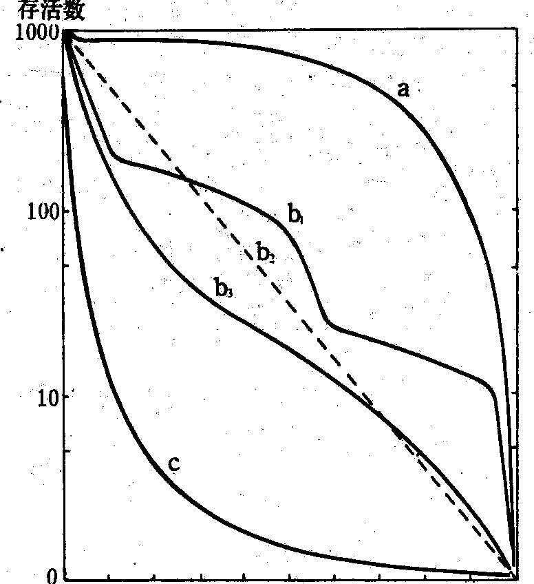 平均寿命=2 289/1 000=2.289年。 注: x是年龄阶段;x′是相对年龄,x′=100(x-平均年龄)/平均年龄; lx是按出生数(l0)为1000换算的x年龄开始时的存活千分率; dx是与出生数相对的死亡千分率,dx=lx-1-lx; qx是各年龄阶段开始时作1 000计算所得的死亡千分率,qx=1 000dx/lx; Lx是x年龄阶段的平均存活数,Lx=(lx+lx+1)/2; Tx是个体年累计,Tx=Lx+Lx+1+Lx+2+……; ex是x年龄阶段个体的平均余年估计值 (人寿保险公司利用该值计算保险费率),ex=Tx/lx。 存活曲线 根据生命表提供的数据,以时间(年龄或相对年龄)为横座标,各年龄组存活数lx为纵座标所作的曲线。lx用对数标尺,相对年龄x′作时间单位,则可把平均寿命相差很大的生物归纳在一个座标系中进行比较。存活曲线更直观地表达出种群各年龄组的死亡过程。根据存活曲线的形状,迪维把它划分为三种类型: ❶a型。接近平均年龄之前的幼体死亡率低,然后急剧上升,呈凸形。大型哺乳动物、猛禽及有护仔行为的某些昆虫多属此类。 ❷b型。各年龄组间死亡率基本相等,呈线形。多数昆虫、某些爬行类、小型鸟兽属于此类。 ❸c型。接近平均年龄之前幼体死亡率很高,其后较低呈凹形。多数鱼类属于此类。研究存活曲线的类型对分析种群动态是很有用的。在生物界,存活曲线有从c型→b型→a型的进化趋势,并有许多中间类型(见图)。