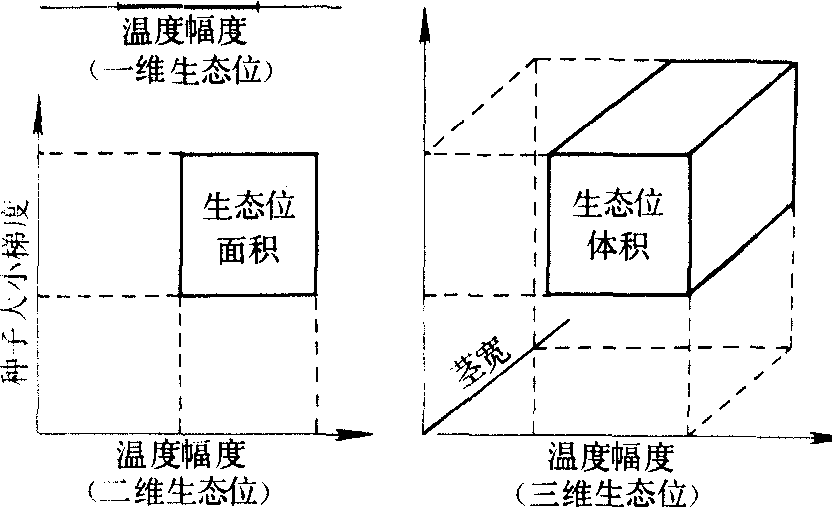 生态位ecological niche又称生态龛。是指在生态因子变化幅度中,能被生物占据、利用或适应的部分。美国约翰森(C. R. Johnson)1910年首先提出这一名词,用以描述同一地区不同物种可以占据环境中的不同位置。 分类:❶按照环境因子的个数,可将生态位分为:一维生态位(one-dimensional niche),如时间生态位、温度生态位;二维生态位(two-dimensional niche),如温湿度生态位;三维生态位 (three-dimensionalniche),如温湿度一食物生态位; 多维生态位或超体积生态位(multi-dimensional或hypervolume niche),如温湿度一食物部位一时间生态位等(图1)。 ❷按照生态因子幅度被生物占据、利用或适应的情况,可将生态位分为:基础生态位(fundamental niche)和实际生态位(realized niche),前者为生物可能和潜在占据、利用或适应的生态因子变化幅度的部分; 后者为生物在受到竞争等影响后实际占据的生态位。 ❸按照生物的组织层次,生态位可分为: 群落生态位、物种生态位、种群生态位及个体生态位等。 ❹按照生物各种行为发生时期所要求的生态位,又可分为: 繁殖生态位(reproductive niche),取食生态位 (feeding niche),扩散生态位(dispersal niche)等。 ❺从生物种群考虑,它所占据的物理空间、它在生物群落中的功能作用(营养位置)、以及它在各种环境幅度中所占据的位置,可分别称为: 空间生态位(spatial niche)、营养生态位(trophic niche)、多维生态位。 ❻鉴于生态因子的变化,有的是连续变化的,如温度和湿度,有的是离散变化的,如降水,则生态位又可分为: 连续生态位(continuous niche)和离散生态位(dispersed niche)。