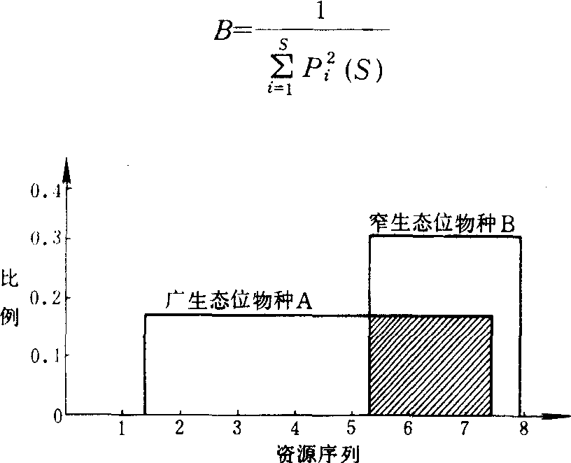 (仿E. P. Odum) 式中 B为生态位幅度;Pi为该物种在一个资源序列的i单位中所占比例; S为每个资源序列的总单位数。B变化的范围为:1/S≤B≤1(图2)。 生态位重叠 两物种或多物种占据相似生态位的现象叫生态位重叠(niche overlap)。计算生态位重叠度的公式为:
