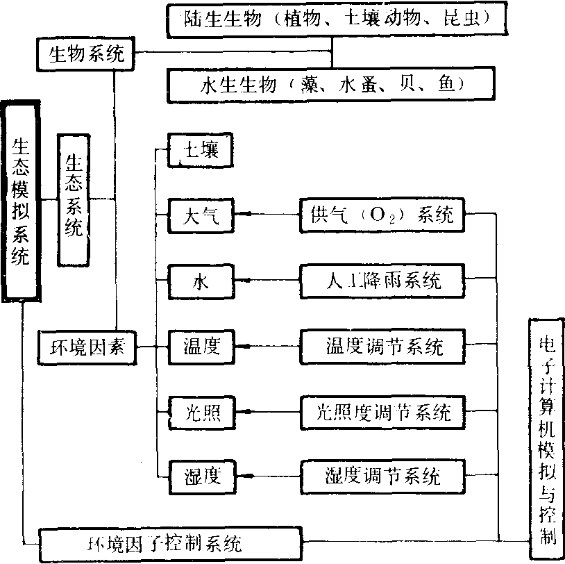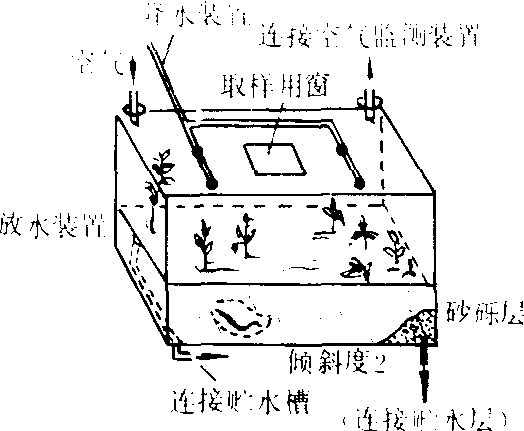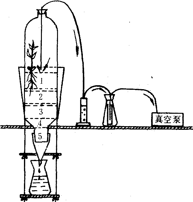 基本结构 早期的生态模拟系统装置比较简单,如供作水生生态系统试验的装置,通常即用大型的玻璃鱼缸或层析缸盛水,按食物链放养多种水生生物;若在其一侧以石英砂堆为陆相,种植作物,放养食叶昆虫,这样就构成了具有陆域和水域的“农田生态系统”;陆生生态系的微型模拟生态装置是由一个可种植植物,又可收集渗漏液的土柱组成(图4)。如要同时研究气体组成成分的变化状况,则要采用密闭式装置并附有气态物吸收系统(图5)。