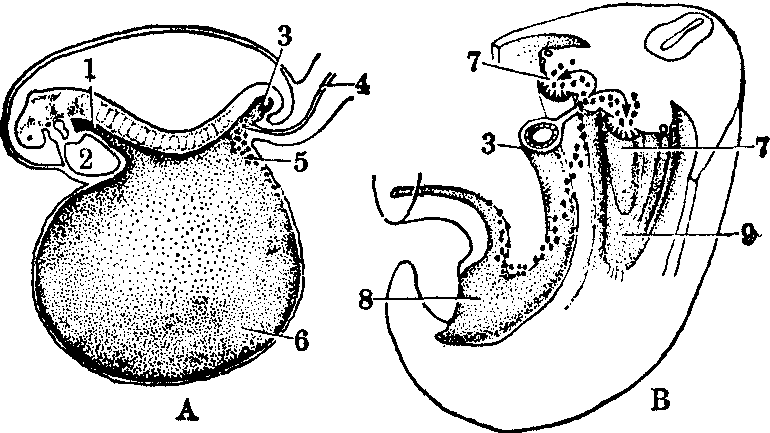 1.前肠 2.心脏 3.后肠 4.尿囊 5.原始生殖 6.卵黄囊 7.生殖嵴 8.泄殖腔 9.中肾