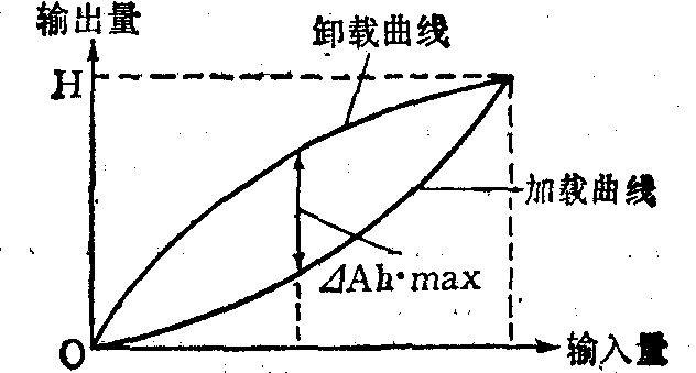 图1 仪器非线性度示意图 非线性度反映仪器的输出量与输入量的实际关系偏离线性比例的程度,其数值愈小,线性愈好。在实际测量中,为数据计算的方便,总希望仪器的输出量与输入量间成线性比例关系,即选用非线性度小的仪器。为计算仪器的非线性度和对实测值进行校准,须先确定仪器输出量与输入量间的理想直线关系。一般是在对应输出满量程范围内,适当实测若干点,按一定规则由这些实测点计算或画出输出量与输入量间的理想直线。 仪器的非线性度常与测量范围有关。满足一定非线性度要求的测量范围称为仪器的线性范围。使用仪器时,应注意输入信号幅度及其直流成分大小,保证被测量处于仪器线性范围内。在使用方法正确和满足仪器线性范围要求下,若测量结果的非线性误差超过规定值则说明仪器发生故障或存在隐患。 滞环误差 表示仪器在输入量由小到大和由大到小变化的两种过程中,输出特性不一致的程度。对应两种过程的输入-输出特性曲线,分别称为“加载曲线”和“卸载曲线”,二者往往不重合,而形成滞环,如图2所示。滞环 误差可表示为 其中△Ahmax为加载曲线和卸载曲线上对应同一输入量的输出量偏差最大值。滞环误差在机械式传感器和记录器系统较为显著。在实际测量中,应选用滞环误差小的仪器,并且在整个测量过程中保持输入量的大小单方向变化,以避免滞环误差的影响。灵敏度 是指仪器在稳态下输出量变化与输入量变化