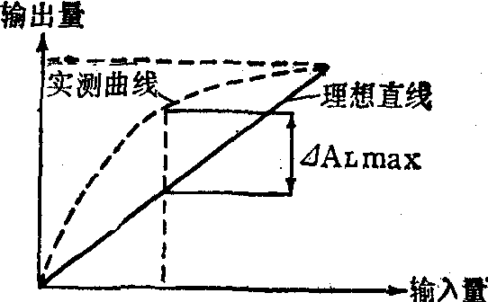 非线性度 用实测值同相应输入量成正比例关系的理 想值间最大偏差与满量程之比表示, ×100%,其中△ALmax为全量程内的实测值与相应理想值间最大偏差,如图1所示。