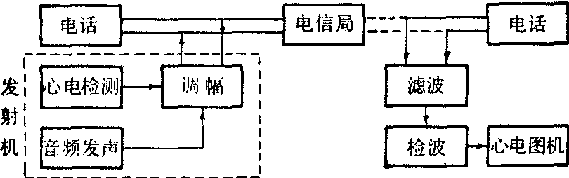 图1 无线遥测系统的一般组成 (1) 多通道遥测装置: 多通道装置能利用一部发射机同时测量多种参数,常见的为2~4通道,也有的多达15通道。多通道遥测系统按工作原理分为频分制和时分制两大类。 ❶频分制系统:按频率划分通道,每个通道占据一个副载频,选择副载频时除使各通道的频谱互不重迭外,还应使它们之间的谐波干扰最小。各通道信号经相加器迭加后对载波进行调制(第二次调制),再从天线辐射出去。接收端先经第一次解调恢复已调制的多通道信号,一般情况下,通道不多时,采用频分制比较有利; ❷时分制系统:按时间划分通道,在发送端用时分开关对多路信号进行采样。为了使接收端能够识别通道的序号,在发送端需加入同步脉冲。时分制的调制方式有脉幅调制(PAM)、脉宽调制(PWM)、脉位调制(PPM)和脉码调制(PCM)。时分制系统主要用脉冲数字集成电路实现,一般情况下,通过数目较多时,为实现小型化采用时分制比较有利。其中,脉码调制系统的抗干扰能力最强,脉宽调制系统在配合使用磁带记录时,可以减少磁带速度抖动引起的噪声。 (2) 天线: 天线的作用是辐射或接收无线电波,在无线遥测系统中占有重要地位,能显著扩大作用距离。在微型发射机中,特别是植入式装置中没有安装线状天线的空间,多采用磁偶极子天线,有时就利用射频振荡线圈作天线,周围电磁场有两个分量其中衰减较慢的远场与距离一次方成反比 当距离等于1/6波长时,近场与远场的强度相近。由于工作距离往往远大于波长,故实际应用中多利用远场分量。仅当植入式系统等发射功率十分微弱的条件下才利用近场分量。若需扩大作用距离,最好采用与波长尺寸相当的天线,如1/4波长天线,其辐射效率较高。在不允许使用垂直天线时可采用拖尾天线,腰带天线或装在头盔顶上的折迭式振子天线。接收天线则相对不受空间限制,普通采用<1/4波长的鞭状天线。为了提高接收天线的增益和方向性,也常采用带引向器和反射器的振子天线,又称八木天线。 (3) 电源: 对于体外遥测系统,由于更换电池容易,电池尺寸和工作寿命都不成问题,在电路设计上也不必过分追求降低功耗,故氧化银电池、锌汞电池以及普通的锌锰电池都可用作能源。植入式遥测装置的工作寿命受电源限制,在许多情况下,整个系统的设计首先取决于发射机电源的选择。植入系统要求工作时间长,必须采用低功耗电路和高能量密度电池或体外供电方式。体外供电的方法是体外交变磁场通过体内埋设的谐振回路和二极管转变为直流电,用其对埋藏于体内的全密封式蓄电池充电。或者,发射机与电源整流共用一个谐振回路,当外界磁场消失后,遥测又继续进行。这种供电方法使生物体组织不可避免地吸收较多的高频能量,超过人体的安全剂量,故只允许间断地或短期使用,或用于某些动物实验。 (4)建筑物内的遥测系统: 钢筋混凝土结构的建筑物对电磁波有很大的衰减作用。例如一个作用距离为数千米的遥测系统,在建筑物群附近由于电磁波的反射和吸收,其有效距离仅几百米,在建筑物内使用时只有几十米。在一条100米长的走廊里,虽然两端能够直视,但无法进行可靠的遥测。故在大型建筑物内需采取措施。医院里可在病房、走廊、厕所及楼梯的天花板下悬挂若干宽带接收天线,用电缆将接收到的信号汇合到接收机输入端,这样,在全部天线覆盖区域内就能进行可靠的遥测。电话遥测 利用市内电话的医用遥测,主要用于使用起搏器患者的定期随访。患者定期用遥测装置将心电图传给医疗信息中心,该中心分析了心电图后即可决定患者何时必须到医院调整、治疗或更换起搏器。心电的电话遥测系统如图2所示。该系统的发射机可做成袖珍式,电池供电,患者携带并自行操作。在使用时,先把电极贴在自己的胸前几个特定部位,接通电话,然后把听筒放在遥测装置上,已调制的声频信号通过声耦合器就传给了话筒,这时医疗信息中心便可记录下患者的心电图。为了使患者操作方便,一般只包括两个导联的心电图。最后,患者还可通过电话听取医院的建议。这种遥测系统能给医院的管理工作和患者带来方便。 ![]() 图2 心电遥测系统 ☚ 手术监护 医学微型计算机系统 ☛ 生物医学遥测 生物医学遥测航天生物医学遥测技术是生物医学电子学的一个分支。它利用“远动技术”将航天员的生理信息变换、处理传送到地面。由于目前多采用无线电波作为传递媒介,故也称此项技术为“无线电生物医学遥测技术”。藉助于此种技术,地面的航天医学工作人员可对正在太空中航行的航天员的生理变化进行实时观察和分析。生物医学遥测系统的组成如图1所示: