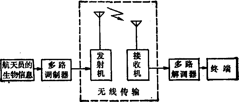 图1 生物医学无线电遥测系统 航天员的生物医学信号可分为“电量的”和“非电量的”两类。前者如心电、脑电、肌电、眼震和其它细胞生命活动所产生的生物电信号等; 后者如呼吸频率、体温、动脉血压、脉搏、心音、心输出量、血流速度等,须由相应的传感器先转换成电信号。生物医学信号一般都极其微弱,易受人体活动和外界干扰,因此均要求选用高增益、高输入阻抗、低漂移、抗干扰性能良好的前置放大器与遥测通道匹配。与人体接触的电极、传感器应具有使用方便、小型化、长期使用不刺激皮肤、不损伤身体、耗电量少、抗干扰性能强等特点。 多路调制器 航天飞行器中待传输的信息很多,又只能用一条无线电通路传输到地面,因此必须经过一个多路调制器将大量的信息经综合后送往无线传输系统。按工作原理,可将多路调制器分为“频率分割制”和“时间分割制”两类。 (1) 频率分割制多路调制器(FDM): 有几个信息源,对应地即有几个不同频率的副载频振荡器。依照调制方式不同,又可分为: “调幅制”,改变振荡器幅度;“调频制”,改变频率;“调相制”,改变相位。已调制的几个副载频经相加器输出一个综合波去调制高频发射机,再经无线电波传送到地面站。 (2) 时间分割制多路调制器(TDM):它是按一定的时间顺序依次传输各路信号,也就是对每路轮番进行采样。根据采样定律,信号不失真的采样速率至少应等于信号最高频率的两倍,但通常取3~5倍。由于采样时间可以很短,因此在一路信号的两个采样点之间传送其他路的采样信号。这样就可能用一条无线传输线路传送几十、几百、甚至更多路的信号。这么多的信号周而复始传送到接收站,要想正确无误地进行区分,必须加入一个不同于信号的标记,即同步信号。要求同步信号与传送的信号有最少的相关性和高的抗干扰能力。 时间分割制多路调制器的种类甚多,按调制方式不同,可分为“脉冲调幅”(PAM)、“脉冲调相”(PPM)、“脉冲调宽”(PDM)、“脉冲编码”(PCM) 等。而每种方式中又有“一次调制”、“二次调制”和“多重调制”之分。其中,脉冲编码制由于它具有检错纠错码的能力、强的抗干扰性、高准确度以及数据可以直接进入计算机处理等优点,因而在航天遥测中已被广泛采用。 无线电波传输 将航天器中待测的信号传送到地面接收站。无线电传输线路包括航天器上的无线电发射机、发射天线,以及地面站的接收天线和接收机。可分为“短波遥测”、“超短波(或微波)遥测”和“贮存/回放遥测”。短波传输借助于电离层的反射作用,理论上可以实现全球传送,航天器飞离地面站上空也能收到信号。但这类传输容量低,只允许传送航天员的少量信号。超短波 (或微波)传送,因频率高而容量大,航天器上大部分信号可以藉此传送。但因超短波只能在视线距离内传输,所以只有星下点遥测站能收到信号;要想全球都能收到信号,必须设立很多接收站,然后通过地面通讯网 (或通讯卫星)再将各站收到的信号传到医务监督分析控制中心。贮存/回放遥测:航天器飞离测量站上空,除藉助短波能收到少量信号外,大部分收不到,此时可用磁带机记录下全部信号,待航天器航行到测量站作用范围内时,测量站发出指令,将磁带机记录的信号高速回放,用大容量的短波传输设备传送到接收站。上述几种方式各有长短,通常是综合利用,互为补充。 随着航天技术的发展,近来又出现“二次遥测” (或称“中转遥测”)。在航天员出舱作业或登月时,医务监督所需生理信息不允许中断。为了便于航天员在舱外自由作业,也不能用有线方式把生理信号传到航天器内。航天员随身带的能源有限,亦不能将信号直接传送到地面站,而只能由航天员携带一个微功耗的小型遥测系统,将航天员的生理信号首先传送到航天器中,经后者的大型遥测系统再中转到地面站,以对航天员进行实时医务监督和生物医学观察。 目前无线传输信息多用无线电波作为媒介,但以光为媒介的遥测系统不久将进入实用阶段。红外线传输系统利用红外光线作传输媒介,优点是信息量大,不易被发现和截获,几乎不受雷电、电器等干扰。激光传输系统容量巨大、保密性强、方向性好、不易被干扰、设备结构简单。紫外线、γ射线传输系统都是以波的形式传输信息,只是波长不同,也同样具有激光传输系统的优点。 多路解调器 是完成接收机送来的多路信号的分离设备,即多路调制的反变换,也有“频率分割制”和“时间分割制”之区别。 (1) 频率分割制多路解调器: 是利用中心频率不同的滤波器将各路副载波区分开,而后对每路副载波进行解调得到相应的初始信号。分离副载波的滤波器有,“机械滤波器”、RC滤波器、LC滤波器、有源滤波器、数字滤波器等。随着数字技术的发展,调频信号的数字滤波解调器的应用越来越广泛。 (2) 时间分割制多路解调器: 它是解调时间分割制多路遥测信号的设备,也即时间分割多路调制的反变换器。其中,同步器被视作时间分割制解调器的“心脏”,一旦失灵,全部信号就无法解调出来,因此要求同步器具有高的抗干扰能力和可靠性。由于数字技术的发展,测量路数的增加,调制器类型越来越多,与之对应的解调器的种类也越来越多,但解调器必须与调制器一致起来。 近来出现一种能灵活运用的遥测系统,称 “可编程序(或“