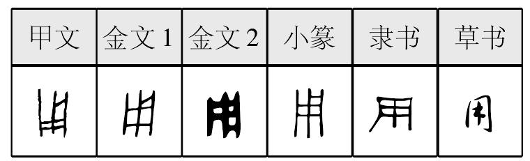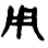 用 甲骨文; 金文; 篆yòng[象形,初文像鐘形。(《説文》:“用,可施行也。從卜,從中。衛宏説。 ,古文用。臣鉉等曰:卜中乃可用也。”不確,用,非從卜從中。“用”的初文像鐘,“甬”本字(于省吾)象形。假借爲“使用”,另造“甬”字。用〈使用、用處、費用〉。又指吃,喝〈請您用茶〉。)] 《詩經·小雅·節南山》:“國既卒斬,何不用監?”(國家既然快破滅,爲何閉眼不監察?) [春秋] 左丘明《左傳·襄公二十六年》:“雖楚有材,晉實用之。”(楚國雖有人材,但爲晉國所利用。) [戰國] 孔伋《中庸·第二十八章》:“愚而好自用。”(本來是愚笨的人却自以爲聰明。) 用(yòng)“ ,可施行也。从卜,从中,卫宏说。凡用之属皆从用。臣铉等曰:卜中乃可用也。 ,古文用。”(余讼切) 甲骨文作 、 ,金文或作 、 。文字学家对字形解说不同。徐中舒《甲骨文字典》认为字形象卜者看骨版上卜兆来确定所卜问的事是否能得到施行。杨树达《释用》根据甲金文字形,结合文献,提出“用”为“桶”的初文。然后又以《毛公鼎》之“簟弻鱼 ”即《诗·小雅·采芑》之“簟茀鱼服”为据,认为 即《说文》弩矢箙之箙,由此变为今之 字, 下亦从用,进一步确认了“用”之为桶的论断。桶为受器,为用至广,引申为一切器用之用。[1]于省吾说:“用字初文作 ,象甬(今作桶)形,左象甬体,右象其把手。近年出土的云梦秦简还以用为桶(一九七六年《文物》第七期),进一步证明了这一点。……用字初文本象日常用器的桶形,因而引申为施用之用。用甬本是一字,故甲骨文以 为通。周代金文甬字作 ,上端加半圆形以区别于用,是后起的分别字。”[2]卜辞中有用其引申之义的,如“叀兹丯用”(《佚》241)即兹用丯,丯为祭品。许慎引用卫宏说法则是,占卜而中,所卜之事就可行了。这是根据小篆字形作出的解释。 “用与不用是甲骨学术语,出现在命辞之后,表示对命辞内容可施行与否的裁定。《合集》30719:‘ (侑)于且乙一牛?用。’《殷契佚存》86:‘辛未又(侑)于出日?兹不用。’甲骨文、金文又特指杀牲(含人牲)以祭。”[3]金文中“用”作连词较多,可用来表示并列关系、相承关系、因果关系等。 用部下有四个属字。如:“甯,所愿也。从用,寧省声。”今谓宁愿,即此义。 用yòng(5画)