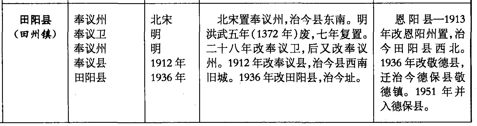 田阳县(田州镇)奉议州奉议卫奉议州奉议县田阳县北宋明明1912年1936年北宋置奉议州,治今县东南。明洪武五年(1372年)废,七年复置。二十八年改奉议卫,后又改奉议州。1912年改奉议县,治今县西南旧城。1936年改田阳县,治今址。恩阳县—1913年改恩阳州置,治今田阳县西北。1936年改敬德县,迁治今德保县敬德镇。1951年并入德保县。