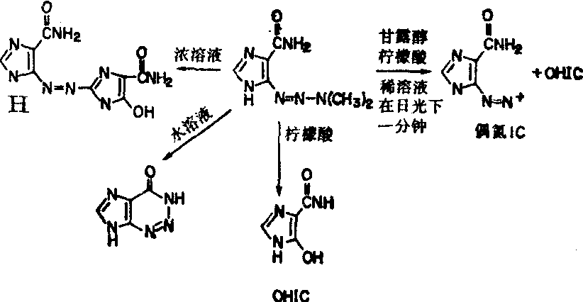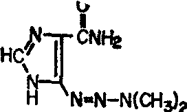 甲氮咪胺 (dacarbazine) 又名氮烯咪胺、deticene、DTIC、DIC。是治疗恶性黑色素瘤的主要药物之一。为白色结晶,m.p. 250~255℃(分解)。在室温1mg溶于1ml水。对光高度敏感,中性溶液在避光下稳定。静脉制剂含有无水枸橼酸和甘露醇,亦可用甲氮咪胺枸橼酸盐或酒石酸盐。 从寻找5-氨基-4-氨甲酰咪唑(AIC)类似物,以抑制核酸合成的设想出发,发现重氮咪唑氨甲酰对实验动物肿瘤有抑制作用。甲氮咪胺作为后者的潜药合成于1959年,它对多种实验动物肿瘤有活性,对艾氏瘤实体型的活性在等克分子剂量下,与丝裂霉素、环磷酰胺和巯基嘌呤的活性相近。在体外和体内甲氮咪胺对RNA和蛋白质合成的抑制强于对DNA的作用。地鼠的卵巢细胞或人的恶性黑色素瘤细胞以N-甲基14C标记的甲氮咪胺处理,只在避光下才能与DNA结合产生标记的DNA。用环上2位14C的甲氮咪胺则不论避光与否,都能找到标记的DNA和RNA。在人、狗或小鼠,其主要代谢物为AIC。此外,从服用甲氮咪胺的患者和大鼠的尿中能分离得7-甲鸟嘌呤。 本品遇光很快分解为二甲胺和高细胞毒的重氮IC,后者环化为低活性的氮杂6-羟嘌呤(2)。在无光下,甲氮咪胺经微粒体氧化酶氧化为羟基化合物(3),然后产生单甲基衍生物(MIC),再分解为AIC和具有烃化作用的阳碳离子CH+3,后者烃化核酸碱基而产生7-甲鸟嘌呤。甲氮咪胺的羟基化合物不稳定,无法比较它和原药的活性。在对二甲三嗪苯甲酸乙酯(p-C2H5OOC-C6H4-N=N-N (CH3)2)系列中,N-羟甲基化合物的活性高于二甲基和单甲基活性。