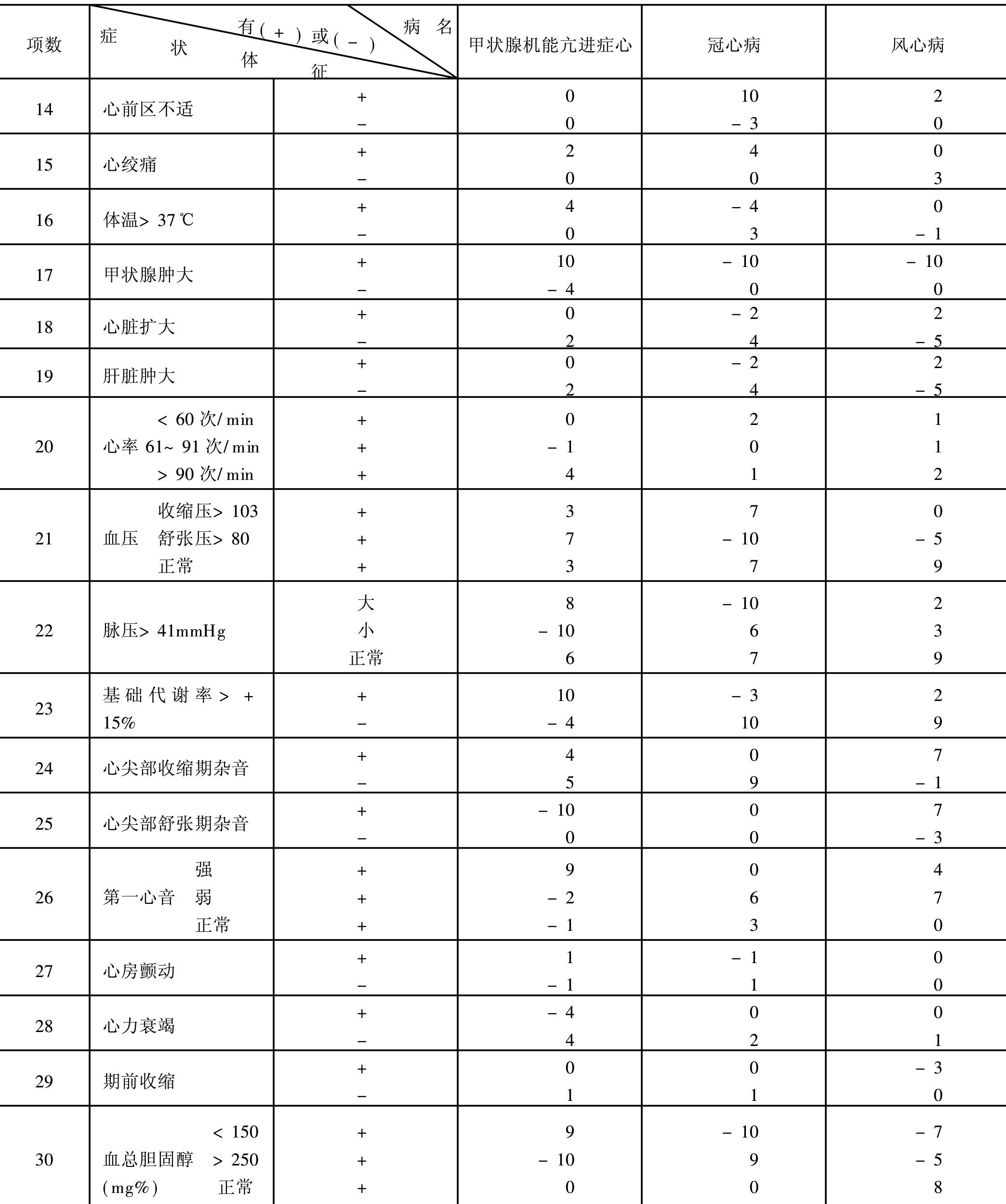 | 释义 | 甲状腺机能亢进症性心脏病计分诊断 甲状腺机能亢进症性心脏病计分诊断scoring diagnosis of hyperthyorid cardiopathy有学者提出以下计分方法并与冠心病和风心病进行鉴别(见下表)。 甲状腺机能亢进症性心脏病鉴别诊断计量表