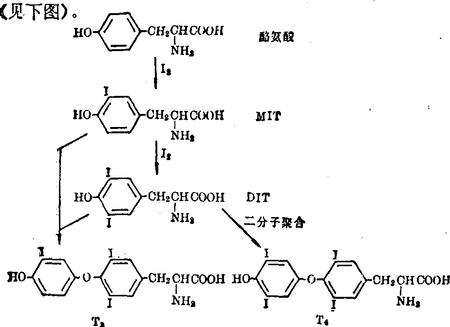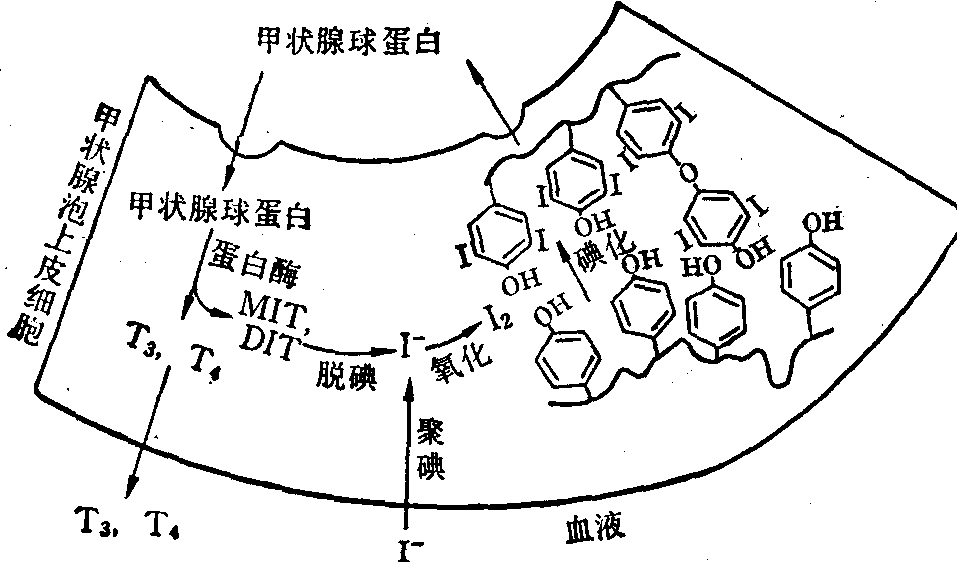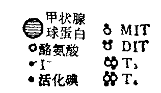 聚碘 通常食物每天可供应100~200μg碘,食物中的碘在胃肠道还原成为I-后被吸收入血液。甲状腺中碘的浓度比血浆高约25倍。当甲状腺功能亢进时,则可高于血浆数百倍,所以甲状腺具有强大的聚碘能力。甲状腺聚碘是逆浓度差进行的,为一种主动摄取,可称为 “碘泵”。需要消耗能量,能量来源于依赖Na+,K+的ATPase(Na泵)分解ATP所提供。 碘的氧化 I-进入滤泡上皮细胞后,需氧化成“活性碘”的形式,才能合成TH。I-的氧化是由过氧化物酶催化。 H2O2由生物氧化过程中产生。酪氨酸的碘化和T4、T3合成 酪氨酸先与碘反应生成一碘酪氨酸(MIT)和二碘酪氨酸 (DIT),两分子DIT相连而成T4。T3则主要在周围组织中由T4脱碘产生,但在上皮细胞内也可由1分子MIT和一分子DIT连接生成(见下图)