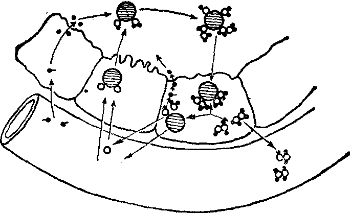 ![]() 甲状腺激素合成、贮存与释放的主要过程示意图 合成甲状腺激素的第一步是甲状腺细胞从细胞外液中摄取碘,这是逆电化学梯度的主动运转,细胞膜上运转碘的物质称为“碘泵”。过氯酸盐、过锝酸盐与硫氰酸盐均能与I-竞争碘泵而抑制I-的摄取。在先天性缺乏“碘泵”的病人,只要血浆中保持够高浓度的I-,甲状腺细胞也可依靠扩散获得所需的I-。摄入的I-在过氧化酶与过氧化氢作用下先迅速氧化成为“活化”型的碘,随即进行碘化,即置换甲状腺球蛋白的酪氨酸残基环上第3位和第5位的质子形成单碘酪氨酸 (MIT) 或双碘酪氨酸(DIT)。甲状腺细胞内的可溶性还原物质如维生素C、还原型谷胱甘肽均能还原已活化的碘。抑制碘化。甲状腺细胞内的过氧化氢酶能破坏过氧化氢而阻抑活化,高浓度I-本身也抑制碘化过程,碘化主要是在腺泡腔内靠近顶部细胞膜处进行的。在同一过氧化酶系的催化作用下,一些已碘化的酪氨酸残基可缩合成为T4、T3或r-T3。所形成的T4、T3与r-T3仍结合于甲状腺球蛋白分子上并贮存于腺泡腔内,形成腺泡腔中胶质。正常人甲状腺含碘约8mg,90%在甲状腺球蛋白上,而其中一半又在碘化酪氨酸残基中,在碘化甲腺原氨酸残基中的不过40%左右。在碘化甲腺原氨酸残基中T4最多,约为T3的10~20倍,为r-T3的80~100倍。供碘多时,DIT与T4含量较多而MIT与T3较少,缺碘时则相反。甲状腺分泌激素时,腺细胞将甲状腺球蛋白胞饮入胞质形成胶质小滴并与溶酶体融合成为吞噬体,于是甲状腺球蛋白分子即被溶酶体的酸性蛋白水解酶系所水解,T4与T3水解下来后直接由基部细胞膜扩散入血液。MIT和DIT则在胞质内脱碘,所脱下的I-大部分在细胞内再利用,也有部分由甲状腺细胞逸出,称为“漏碘”,食物供碘量大则漏碘亦多,这可能是防止过分碘化的自身调节过程;酪氨酸与其他氨基酸可再用于合成甲状腺球蛋白。水解甲状腺球蛋白必须先将其分子中的双硫键还原成硫氢键,因而需要有转氢酶与还原型谷胱甘肽,这就依靠谷胱甘肽还原酶与还原型辅酶Ⅱ。大量I-进入细胞可抑制谷胱甘肽还原酶,因而抑制甲状腺激素的释放。 血液中的甲状腺激素 正常成年人血浆含T4 5~12μg/100ml,平均约8.5μg/100ml;T380~200ng/100ml,平均约120ng/100ml;而r-T3极少,平均约40ng/100ml。血液中的T4都是由甲状腺分泌的,而T3只有25%、r-T3只有3%是由甲状腺分泌的,其余75%的T3和97%的r-T3都是T4在外周组织脱碘的产物。 血液中甲状腺激素的型式 血液中的甲状腺激素绝大部分与蛋白质结合,血中的蛋白质结合碘主要是甲状腺激素中的碘。与甲状腺激素结合的蛋白质有三种: 甲状腺素结合球蛋白 (TBG)、甲状腺素结合前白蛋白(TBPA)和血清白蛋白。 血浆中T4有99.97%与蛋白质结合,其中75%与TBG结合,10%与白蛋白结合,游离T4(FT4)只有0.03%即约2ng/100ml或4×10-11mol/L。血浆中T3与蛋白质结合的约占99.7%,主要与TBG结合,少量与白蛋白结合而与TBPA结合的极少,游离T3(FT3)约0.3%即约0.4ng/100ml或1×10-11mol/L。r-T3与这些蛋白质的亲合力与T3近似,但血浆中r-T3的含量只有T3的1/3左右,游离r-T3为0.3%,其浓度只有0.1ng/100ml。甲状腺激素对细胞代谢的作用或是对腺垂体的反馈作用的强弱均取决于血中游离甲状腺激素的浓度。先天性TBG缺乏的病人其血浆内T4总浓度低到2~3μg/100ml,TBG增多的病人其血浆内T4总浓度可高达15~20μg/100ml,但这些病人血浆中FT4的浓度常保持在正常范围内,其甲状腺功能状态也可保持正常。此外,大多数哺乳动物血浆中T4的总浓度相差很大而FT4的浓度却相当接近,一般为每100毫升1.8~3.3ng。这些都提示,血液中只有游离型的甲状腺激素有生理效应或进入组织内分解破坏。这就是所谓“游离甲状腺激素假说”。与甲状腺激素结合的这些蛋白质,其生理作用主要是缓冲血液内游离激素含量的急剧变化,防止这些激素从肾脏大量流失。 血液中甲状腺激素的更新 正常人处于生理平衡情况下,在单位时间内所产生和破坏的甲状腺激素量基本相等,因而血浆中甲状腺激素浓度能保持相对恒定。正常人血液中三种甲状腺激素的更新情况见下表: 三种甲状腺激素的更新率