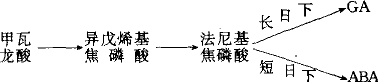 又称甲羟戊酸。赤霉素和脱落酸生物合成过程中的共同前身物。结构式如下。它由3分子乙酰辅酶A缩合而成。甲瓦龙酸经异戊烯基焦磷酸、法尼基焦磷酸,最后形成赤霉素或脱落酸。日照条件可调控GA和ABA的形成。长日照有利于GA的合成,而ABA则需要短日照。GA和ABA生物合成的关系如下所示: