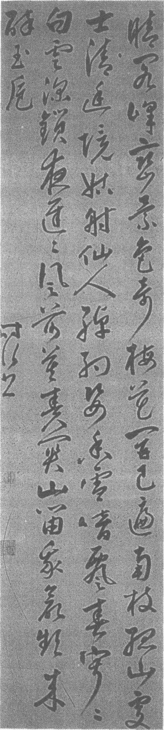 | 释义 | 申时行草书七言律诗轴 申时行草书七言律诗轴明。纸本。纵186.2厘米,横39.6厘米。上海博物馆藏。申时行(嘉靖十四年—万历二十四年,即公元1535—1614年),字汝默,号瑶泉,晚号休休居士,长洲(今江苏省苏州)人。嘉靖四十一年,即公元1562年进士第一,授修撰,历左庶子,掌翰林院事。万历五年,即公元1577年,由礼部侍郎改吏部,以文字受知张居正,官吏部尚书。卒谥文定。诗文词藻流丽婉转。明叶向高《苍霞草》:“文定善真、行、草书,有《赐闲堂帖》行世。”明过庭训《分省人物考》云:“时行廷试时,上见其词翰兼美,亲擢第一。”著有《赐闲堂集》。《明史》卷二百十八有传。此幅草书七言律诗:“晴阁峰峦景色奇,梅花开已遍南枝,孤山处士清幽境,姑射仙人绰约姿。香雪暗飘春寂寂,白雪深锁夜迟迟,风前莫奏关山笛,我欲频来醉玉卮。”款署“时行书”。首钤朱文<崇纶堂>长方印,款下钤白文<瑶泉>、<大学士印>两方印。用笔以圆厚为主,婉转浑凝,结字平稳疏朗,姿态秀逸,给人以自然清雅洒脱之感。