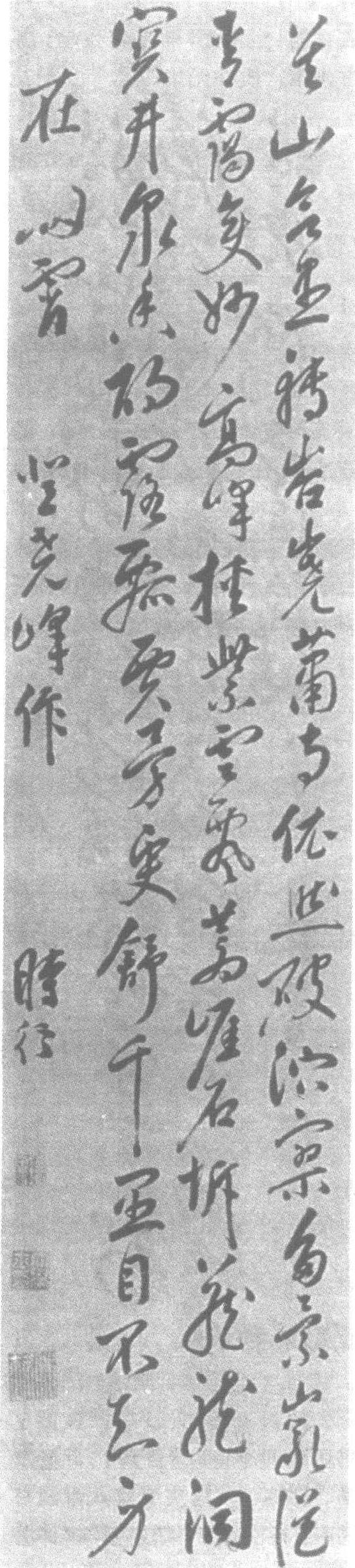 明。纸本。纵137.5厘米,横30厘米。江苏省苏州博物馆藏。申时行(见《申时行草书七言律诗轴》条目)书。“尧峰山”在苏城西南,横山西起之最高峰。传说尧时洪水泛滥,吴人避居于此,故得名。山中有清辉轩、碧玉沼、多景岩、宝云井、白龙洞、观音岩、偃盖松、妙高峰、东斋、西隐等十景。此诗是作者登尧峰山时作“吴山欲尽转岧峣,萧寺依然破泬寥。多景岩从青霭变,妙高峰挟紫云瓢。苍崖石坼藏龙洞,宝井泉香酌露飘。贾勇更舒千里目,不知身□在□霄”。款署:“登尧峰作,时行”。行草书体深得二王之书风,字体多颀长魁伟,行笔悠然自得,使转轻捷灵妙,柔中寓刚,笔致流畅生动,清秀雅洁,静动结合,给人以自然清雅之气息。