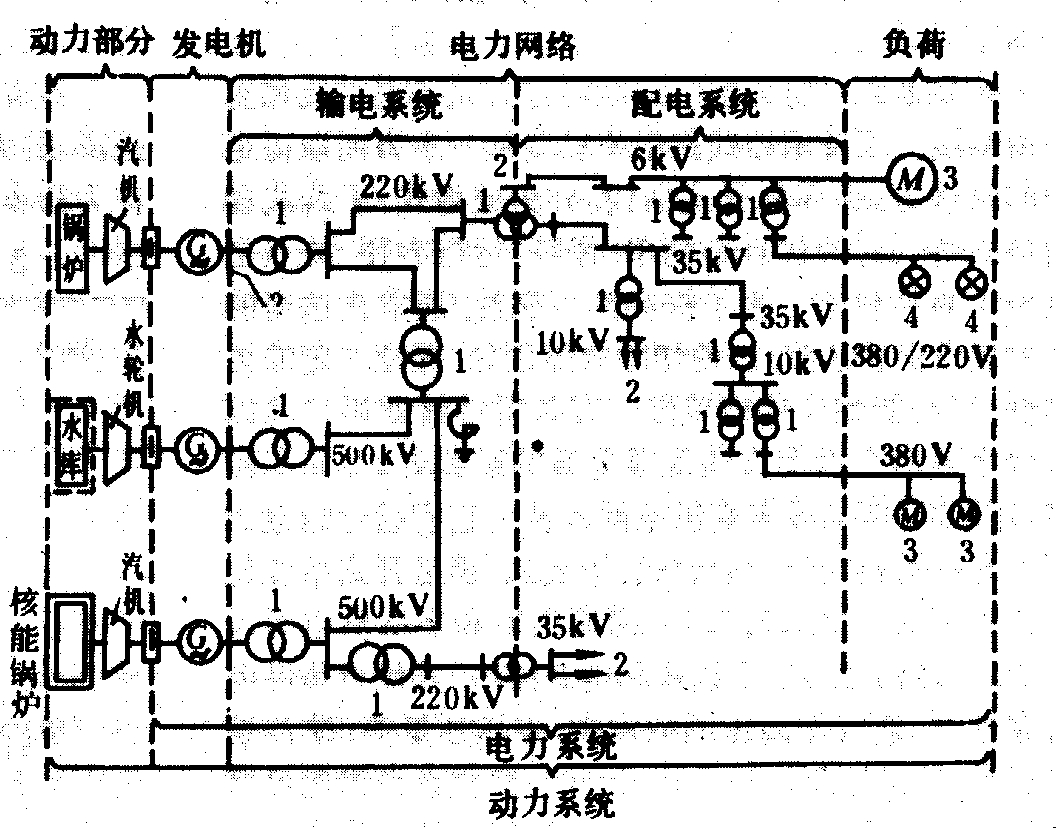 电力系统的基本构成 1.变压器; 2.负荷; 3.电动机; 4.电灯 电力网按供电范围及电压等级可分为: 地方电力网,其电压为35千伏或110千伏,送电距离可达几十公里,是向城镇、工矿及农村供电的供配电网络; 区域电力网,其电压为110~220千伏,送电距离可达数百公里,是在省(区)内将地方发电厂与多种类型用户联系在一起的网络; 超高压电力网,主要由交流330~500千伏或直流±500伏,或由更高电压的送电线路组成,承担着大型水电站、坑口火电站或核电站向负荷中心送电任务; 或将区域电力网相互联系,形成跨区域甚至跨国的联合电力网。 以超高压电力网将区域电力网互联而形成的联合电力网具有: 减少系统的装机容量及备用容量; 合理利用水能资源,提高运行经济性; 在网络结构合理的条件下,提高供电的可靠性等优点。 概况 中国自1882年在上海建立第一个火力发电厂以来,发展非常缓慢,至1949年发电设备总容量仅为185万千瓦,年发电量仅43亿千瓦小时,110千伏以上电压等级的电力系统仅东北三省有两个,总容量为72万千瓦。1957年底,发电设备总容量增加为464万千瓦;1962年底,又增加为1300万千瓦。1978年,发电设备总容量进一步增加为5211万千瓦,年发电量增加为2565.5亿千瓦小时。110千伏以上电压等级的电力系统增加为数十个。其中,大电力系统的容量已超过700万千瓦,最高电压等级已达330千伏。1988年全国已形成12个百万千瓦以上的大电力网,华北、东北、华中和华东已初步形成以500千伏为骨干网架的跨省区电网,它们的装机容量均超过15000兆瓦,全国拥有35千伏以上送电线路41.87万公里,主变压器容量176200兆伏安。到1988年全国已拥有1000兆瓦以上的电站12座,其中水电站2座,火电厂10座。 结线方式 电力系统结线可分为无备用结线和有备用结线。无备用结线指用户只能从一个方向取得电源的结线方式,亦称开式结线,分为放射式、干线式和树枝式等。它的优点是简单、经济、运行方便,缺点是供电可靠性较差。为了提高其可靠性,通常在适当的地方装设保护装置,以便切除故障部分,保证一定的可靠性,尽可能缩小停电范围。有备用结线即用户可以从两个或两个以上方向取得电源的结线方式,如双回路、环形网、两端或多端供电网以及由它们组合的电力网。有备用结线分为放射式、干线式(仍是开式结线)、链式和闭式(分单环、双环、两端供电和多端供电等)。对于双回路放射式、干线式和链式结线,其优点是供电可靠性高,适宜作高压网的网架,电压质量高,缺点是投资大、经济性差。对于环式结线,其优点是供电可靠性与经济性较高,缺点是运行维护复杂,发生故障及检修时,电压质量差,在检修时供电处于无备用状态,供电可靠性相对降低。对于两端供电的闭式,其优点是供电可靠性高、经济、故障检修时电压质量好,缺点是运行复杂,必须具备两个或两个以上的电源时,才可采用。 城市、农村供电系统具有变配电设备和线路数量大的特点,其结线方式随着供电地区负荷密度和对供电可靠性的要求而不同。城市供电网多采用多端供电的结线方式,农村供电网多采用干线式。 电力系统中各种主要元件相互联接的方式,直接影响电力系统运行的安全性和经济性,对电力系统的设计和运行关系十分密切。在选择电力系统结线方式时,应考虑保证用户供电的可靠性。当电力网中某一部分发生故障时,应由继电保护装置将故障部分迅速切除,以保证系统中其他部分持续运行。对于不容许间断供电的重要用户,应备有双电源供电或多电源供电,能灵活地适应各种可能的运行方式。电力系统的运行方式随着用户负荷和发电厂输出功率的变化而有不同的运行方式。在发电厂、变电站及线路定期检修或事故检修时,运行方式也要变化。电力系统的结线应能适应这些运行方式的变化,而不降低供电可靠性和电能质量;应力求节约设备和材料,减少设备费用和运行费用,使电力网的建设和运行比较经济;应保证各种运行方式下运行人员能安全操作。 电压等级 为了利于电力设备制造和运行维护,并考虑电力系统输送电能的经济性,要求电力系统的电压等级尽量简化,相邻电压之比为2~3较相宜。中国公布的交流送电电压标准为:6、10、35、60、110、154、220、330、500及750千伏。其中6、60及154千伏等级只是暂时保留使用,将不予发展。现用的电压组合为:6~10/35/110/220/500千伏及6~10/35/110/330千伏,正在兴建的直流输电线路的电压等级为±100千伏及±500千伏。 各级电压送电线路的输送能力(送电容量与送电距离)的大致范围如表所示。在制定电力系统规划时,作为初步确定电压等级的依据。 各级电压与送电容量和送电距离的关系