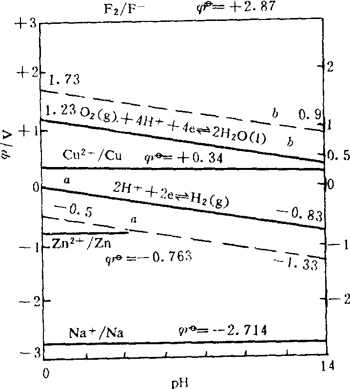 图1 水和某些电对的电势-pH图