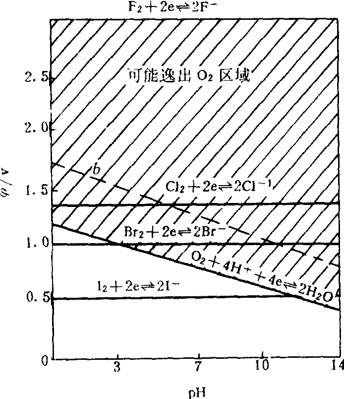 相应的φ与pH关系式为: φH+/H2=-0.0591pH 由于超电压的存在,使上下两线各需向外伸展出0.5V,得到实际的b线和a线 (即图中两条虚线)。 图2是卤素与水体系的电势-pH图。 图中各线位置高低反映了各电对电极电势的相对高低; 直线斜率的大小反映了各电对电极电势受pH影响的大小; 上面的直线所代表的电对的氧化型物质可以氧化下面直线所代表电对的还原型物质。电势-pH图的用处如下: