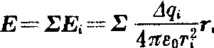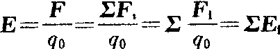 r13、r23分别为q1、q2指向q3的单位矢,r13、r23分别为q1、q2与q3之间的距离,这意味着,一个点电荷作用于另一点电荷的静电力总是符合库仑定律,与其周围是否存在其它电荷无关。由上式,根据场强定义,并将q3理解为试探电荷q0,则该处的场强为 ![]() E1、E2为q1、q2单独存在时在该点的场强。对n个点电荷产生的场、观察点(场点)的场强为