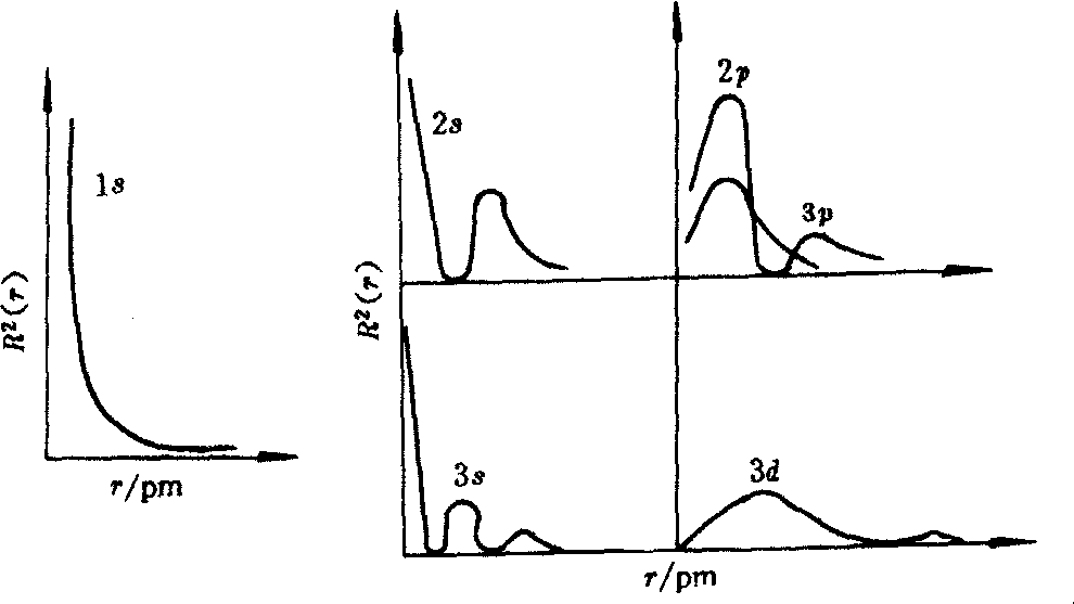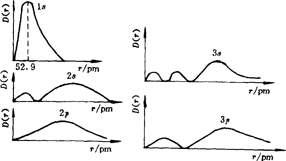 图3 氢原子电子云径向密度分布图 ❷径向密度分布图 |R(r)2|为电子云径向分布函数,用|R(r)2|值对r作图,即得电子云径向密度分布图,见图3。 图中曲线表示在任意方向上电子云密度随r变化的情况。如,对氢原子的1s态在核附近有最大的电子云密度,随r增大,密度下降; 对2s等曲线有为零的地方,这相当于空间的球面上电子出现的几率为零,称为节面。 ❸ 径向分布函数图 人们将D(r)=4πr2R2(r)dr定为几率径向分布函数,其物理意义是电子在距核半径为r处的球面附近、单位厚度球壳内出现的几率。将D(r)对r作图,就得到电子云几率径向分布函数图,见图4。 D(r)除了与R2(r)有关外,还与球壳体积4πr2dr有关,综合这两个因素基态氢原子在距核52.9pm的空间球壳内出现的几率最大。电子云几率径向分布函数图反映了核外电子几率分布的层次及穿透性,常用来讨论多电子原子的能量效应 (屏蔽和钻穿效应)。