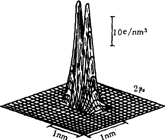 图7 氢原子2px电子云立体图 ❻立体图 最近有些书刊上还出现电子云的立体图。图7是氢原子2px电子云立体图。它是取通过核的某个平面作为立体图的栅格平面,在垂直于该平面的坐标轴上表现|ψ(r,θ,φ)2|的大小。2px电子云并不呈双峰形,电子云立体图并非电子云的真实“外貌”,而是减少一个变量后才在三维空间作出的一种图象而已。 电子云的不同图象是从不同角度采用不同的近似或简化办法向人们展示电子在核外空间运动的几率分布情况。综合这些图象,可使人们较形象地了解到微观粒子具有波粒二象性以及运动特点是遵从了测不准原理和统计规律。 ☚ 电子云 四个量子数 ☛ |