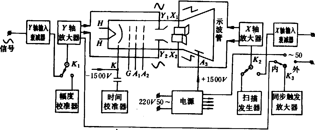 电子仪器electronic instruments以电子元件利用电子学原理构成的用以测量电量或非电量的装置、系统与辅助设备。电子仪器的特点是: 测量范围宽; 灵敏度高; 工作频率广; 输入阻抗高; 可观察电流、电压的波形; 可定量地测量信号的频率、幅度、相位、调幅度、频率特性等参数,与传感器配合,可对非电量进行量测。电子仪器分为通用及专用两类。 通用电子仪器 测量电压、电流、频率、波形、元件参数所用的仪器和各种标准信号发生器。如晶体管万用表、真空管电压表、数字电压表、数字频率计,各种类型示波器、晶体管特性图示仪、集成电路参数测试仪、扫频仪、低频和高频信号发生器、脉冲信号发生器等。 真空管电压表 用来测量正弦电压有效值的仪器。它具有输入阻抗高、输入电容小、测量频率范围宽及灵敏度高等特点,常用来测量频带宽、正弦交流电压微弱的有效值,测量电压的范围为1毫伏~300伏,测量频率范围为25赫~200千赫。真空管电压表是一种放大-检波式电压表。仪器由输入分压器、二级放大器、检波指示电路及整流电源等组成。输入分压器由分压电阻和补偿电容构成,以使被测电压衰减成适于放大器输入要求的数值,以扩大测量范围。由分压器输出的电压送入二级交流电压放大器进行放大,以提高仪器的灵敏度, 在放大器电路中采用了负反馈, 从而改善放大器的频率特性,降低放大器内部的干扰并使放大器的增益稳定。检波指示电路包括峰值检波器和100微安的磁电式表头以及静流补偿电路。由二级交流放大器输出的电压信号, 经检波后成为脉动电压,再经RC滤波取出直流成分, 被测量电压由磁电式表头指示出有效值。整流电源的作用是将工频交流电转换成供仪器真空管工作的直流电, 使仪器能正常工作。 示波器 一种以图形方式显示电信号的电子仪器。示波器还可与其他仪器相结合,测定电路的输入阻抗、输出阻抗,检查各种元器件的参数、电路的工作状态和失真情况,以及对各种非电量的测量。示波器的种类很多,其典型结构框图(图1)组成部分的作用如下: ❶示波管,用来显示X轴和Y轴输入信号之间函数关系的图形。 ❷X轴和Y轴放大器用来放大输入的信号电压,使加到示波管偏转系统上的电压有足够大的数量级。 ❸X轴和Y轴衰减器,通过固定分压比的衰减器,使输入的被研究信号电压,变为振幅适当的电压加到X轴或Y轴放大器上,以扩展信号电压的测量范围。 ❹扫描发生器,它所产生的锯齿波信号是线性的时间函数,当观察各种信号的波形时,将锯齿波信号输入X轴放大器,使示波管的电子束在屏幕的水平轴向,产生均匀的时间基线,以便研究周期性电信号的幅度A随时间t而变化的特性。 ❺同步触发放大器,用来放大和控制取自示波器Y轴放大器的“内”部信号电压,或者工频交流电源电压,或者“外”接信号电压,并注入扫描发生器,使锯齿波信号和同步触发信号之间产生内在的联系,即不但使两者的频率比为整数,并且使两者保持不变的相位关系,使示波管显示出的波形稳定而不动。 ❻幅度校准器,用来提供已知电压的校准信号(50赫正弦电压或1千赫、10千赫方波电压),与被研究信号波形的振幅相比较,以间接测量被测信号的电压值。 ❼时间校准器,用来提供已知周期的“时标”信号,并注入示波管的阴极K或栅级G上,以改变电子流的大小,这样就能以调辉或调暗方式,叠加在被研究信号的波形上,作为测定周期、脉宽等的时间标尺。 ❽电源,电源有多路输出,其输出直流电压有正和负,值为几百伏到10千伏以上。大部分电源采用电子管或晶体管稳压电路。