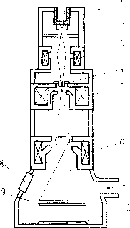 1—高压绝缘;2—电子枪;3—聚光镜;4—样品台;5—物镜;6—投影镜;7—至真空系统;8—观察窗;9—荧光屏;10—照相底板。 ☚ 菲涅耳透镜 偏振光显微镜 ☛ 电子显微镜electron microscope系一种放大倍数与分辨能力极高的物体标本成像设备。电镜是用电子束代替可见光源,用电场或磁场来偏转电子行程的静电透镜或电磁透镜代替光学透镜。由于电子波长极短,故分辨率极高。常用的电镜有通用式和扫描式2种。通用式可放大10万~80万倍,分辨力为0.2nm,能观察病毒结构、蛋白质分子结构、各巨型分子与胶体微粒等。由于电子显微镜的应用使生物学、医学向分子生物学及分子医学迈进了一步。 电子显微镜一种利用由电子透镜聚焦的电子束使极为微细的物体产生放大像的装置。其基本原理是在一高真空系统中,由电子枪发射的电子束穿过样品,经电子透镜聚焦在荧光屏上,显示出一放大的像。这种称为透射式电子显微镜。对较厚的样品,可应用扫描式电子显微镜,它用一束电子对样品横断面逐点扫描,而将所发射的次级电子聚焦在荧光屏上成像。这是最常用的两种。根据不同的成像原理,还有发射式电子显微镜、反射式电子显微镜等各种 类型。 它们广泛用于金属物理学、高分子化学、生物学、医学及工农业生产等各个领域。 电子显微镜见“物理”中的“电子显微镜”。 电子显微镜 电子显微镜电子显微镜是观察细胞和细胞间质成分超微结构的电子仪器。它是利用电子发射器代替光源,在高压电场中发射电子,形成电子束,用电子束代替普通光线。用阳极和阴极对电子的吸收和排斥作用,或用磁场对运动电子的作用,达到聚焦和放大的目的(见图)。由于电子容易为气体分子所散射,因此电子显微镜的内部必须维持高度真空。电子显微镜分为透射电子显微镜和扫描电子显微镜。