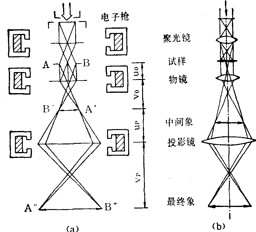 图2 电子束在磁场中的运动轨迹 中心轴的其他一点上,这对电子束说来,磁场起着透镜的作用,称“磁透镜”。电子束在电场影响下亦可成象,但缺点较多,目前多数电镜均不采用。 电镜的磁透镜在线圈外包有软铁的屏蔽外壳,线圈的内侧多数装有高精度加工的铁钴合金极靴。在极靴间隙局部形成具有轴对称的强磁场,这种磁场范围比焦距小的轴对称磁场称为短磁透镜。短磁透镜的焦距与电子加速电压成正比,与透镜磁场强度的平方成反比,透镜磁场强度愈强,焦距愈短,放大倍数愈大。短磁透镜磁场强度与透镜激磁线圈的安匝数(电流与圈数的乘积)成正比,线圈匝数一般是固定的,因此透镜激磁电流愈大,焦距愈短,透镜放大倍率愈大。 电子束通过磁透镜时,速度并不改变,电子束离开原来轨迹形成的折射乃由于外力所致。一个轴对称磁场对电子束的作用相当于一个会聚透镜,但没有明显的界面。 电镜和光镜在光路设计方面有类似处,但电镜采用电子束作为光源。电镜设计必须考虑电子束具有以下特点: ❶电子是带负电的超微粒子,穿透力很弱,唯有在高真空条件下才可能达到一定的自由行程,故电镜镜筒必须保持极高真空,同时,样品必须很薄,一般在100kV加速电压时,样品厚度不应超过0.1μm。 ❷电子束可受电场或磁场影响而改变其行进方向,即使之折射而聚焦,其折射介质为电场或磁场,因而透镜必须是磁透镜或静电透镜。 ❸电子束不引起人眼视觉反应,但可激发荧光物质产生荧光,故电镜观察部分须设置在荧光屏上。 任何显微镜均有四种基本物理过程参与成像,即吸收、干涉、衍射和散射。而在电镜成像过程中,主要是以非弹性散射的反差为主,近年来有人试图以相干光源产生相位反差,来提高电镜分辨本领,但尚属实验阶段。显微镜的分辨率即指其能分辨最近两个质点间的最短极限距离。根据Abbe公式: