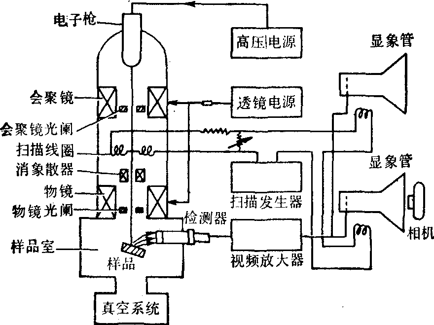 图4 扫描电镜成象原理 子序数衬度,以及有关样品原子种类的信息。扫描电镜成象过程为逐点成象,依赖镜筒内扫描线圈产生磁场,使电子束斑在样品上按照所需周期逐点移动,即所谓“扫描”。同时利用检测系统把各点信息转变为电脉冲调节显象管亮度,由于显象管中光点扫描周期与镜筒中扫描周期严格同步,因此电子束在样品中扫过每一点的相对位置,与显象管屏幕上的相对位置完全对应。由于各点信息强弱不同,因此在显象管的屏幕上就出现如实反映样品表面形貌的明暗图象。显象管屏幕尺寸是固定的,故只须改变电子束在样品表面扫描的面积,就能变更图象的放大倍率。 (2) 构造: 扫描电镜(图5)一般包括以下几个组成部分: ❶产生扫描电子探针的电子光学系统; ❷对样品所激发的信息收集、处理和放大的检测系统; ❸显示系统,即按一定时、空顺序显示在图象上一定位置的信息,此外 ❹真空系统; ❺电源系统。有的扫描电镜尚配有X射线谱仪、阴极发光系统和电子能量损失谱仪等各种不同用