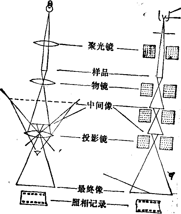 当加速电压为100kV时,波长约为0.04Å。由于电子透镜球面像差的限制,电镜分辨本领未能达其理论极限值,放大倍率取决于分辨本领。 电镜按2Å分辨本领计算,有效放大率应在500,000~1,000,000倍之间。 透射电镜的构造 透射电镜主要由两部分构成 (图3)。 (1)镜筒部分: ❶照明系统。照明系统由电子枪及聚光镜两部分构成。