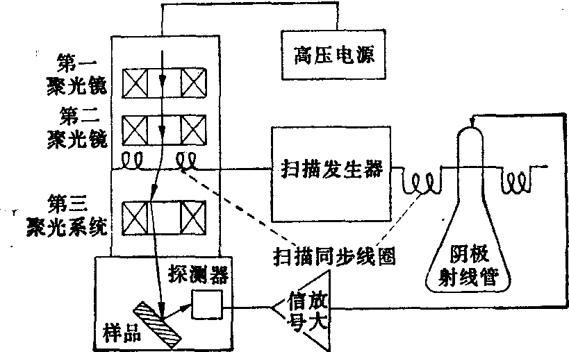扫描电镜 扫描电镜的成象原理如图2所示。由电子枪发射的电子束,经磁透镜缩小为极细的电子束(称为电子探针),入射到试样表面上,并在扫描线圈的作用下,在试样表面上进行扫描,从试样表面轰击激发出二次电子(发射深度为50~500A)等电子,经探测器收集后转换成电压信号,用以调制显象管的控制栅极,使显象管的亮度相应变化。由于显象管与试样的扫描线圈同由一个扫描发生器控制,彼此同步,故显象管所形成的图象反映了试样表面特征的形貌。又由于二次电子的发射与样品表面的形貌及理化性质有关,故扫描电镜的图象能显示试样表面丰富的细微结构,且具有很强的立体感。它所用的试样块不需要进行超薄切片,制作较简单。目前扫描电镜的图象最高分辨本领可达30Å左右。扫描电镜的放大倍数,依试样的扫描距离而变。设显象管屏边长为b,试