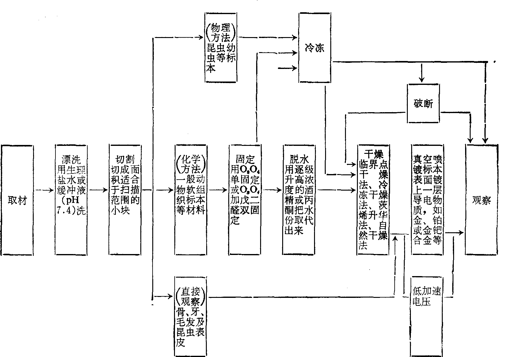图5扫描电镜的基本构造示意图 途的附件,可以对样品进行多方面的测试。(3)样品制作: 见下表 扫描电镜生物标本制作方法