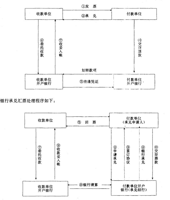 (2)商业汇票 商业汇票是收款人或付款人(或承兑申请人)签发,由承兑人承兑,并于到期日向收款人或被背书人支付款项的票据。按其承兑人的不同,分为商业承兑汇票和银行承兑汇票两种。使用商业汇票的单位必须是在银行开立帐户的法人,必须以合法的商品交易为基础,承兑人到期负有无条件支付票款的责任,允许背书转让。汇票的承兑期限,最长不得超过九个月。 ❶ 商业承兑汇票是由收款人签发,经付款人承兑,或由付款人签发并承兑的票据。收款人或被背书人对将要到期的商业承兑汇票,应送交开户银行办理收款。承兑汇票到期日付款人帐户不足支付时,其开户银行除将商业承兑汇票退给收款银行转退收款人或被背书人外,并对付款人按票面金额处以万分之五但不低于50元的罚款。 商业承兑汇票处理程序如下页图。 ❷ 银行承兑汇票是由收款人或承兑申请人签发,并由承兑申请人向开户银行申请,经银行审查同意承兑的汇票。收款人或被背书人对将要到期的银行承兑汇票,送交开户银行办理收款。承兑申请人于银行承兑汇票到期日存款不足支付时,承兑银行除凭票向收款人、被背书人或贴现银行无条件支付外,应对承兑申请人执行扣款,并对尚未扣回的承兑金额每天按万分之五计收罚息。
