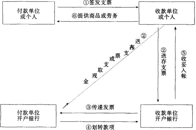 (4)支票 支票,根据用途和使用对象的不同,分为支票和定额支票两种。 支票是银行的存款人签发给收款人办理结算或委托开户银行将款项支付给收款的票据。支票分为现金支票和转帐支票。现金支票可以转帐,转帐支票不能支取现金。单位、个体经济户和个人在同城或票据交换地区的商品交易和劳务供应,以及其它款项的结算均可使用支票。支票一律记名,中国人民银行总行批准的地区转帐支票可以背书转让。签发人必须在银行帐户余额内按照规定向收款人签发支票,对签发空头支票或印章与预留印鉴不符的支票,银行除退票外并按票面金额处以百分之五但不低于五十元的罚款。对屡次签发违章支票的,银行根据情节轻重,给予警告、通报批评,直至停止其向收款人签发支票。使用支票的单位和个人,如果遗失了已签发的现金支票,可以向银行申请挂失;已签发的转帐支票遗失,银行不受理挂失。由于支票结算的手续简单、方便,使用较为广泛。 支票使用的处理程序见下: