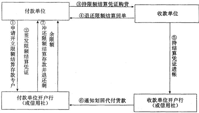 (4)农村限额结算方式 农村限额结算方式,是付款单位预先将款项存入开户银行或信用社,由银行或信用社开给限额结算凭证;自带到县内向收款单位购货,收款单位在限额范围内发货后凭以收取货款的一种结算方式。这种结算方式,带有限额保付的性质,适用于乡镇企业事业单位在县内采购商品或支付农机具修理费等款项的结算。省内跨县的结算,经交易双方县支行和有关单位同意,也可采用。其处理程序如下: