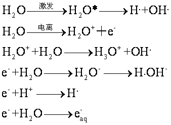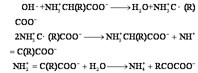上述的射解产物产生在非常小的体积内,并且是在非常短的时间内产生的,反应体积中的自由基,还能发生重合反应形成次级产物H2、H2O、H2O2。辐射与水的全部反应可以总结如下: H2O+辐射—→H·,OH·,e-aq,H2,H2O,H2O2,H3O+,OH-其中OH·自由基和e-aq的产额较高,它们和生物分子反应能力也较强。例如: (1) OH·与甘氨酸、赖氨酸等脂肪族氨基酸的反应,主要是脱氨基作用: