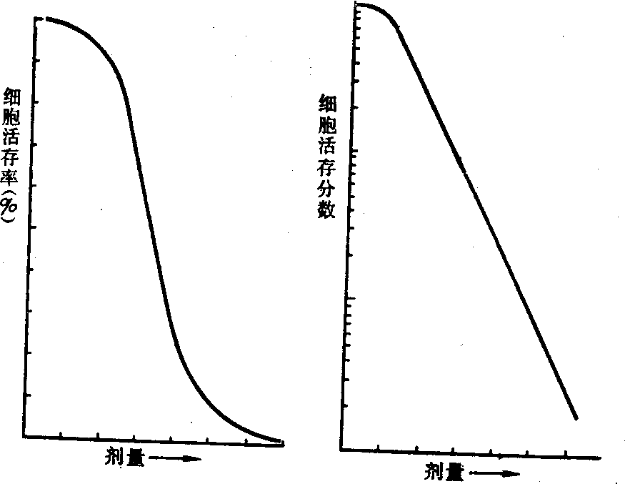 有增殖能力的哺乳动物细胞,受一定剂量照射,一部分“死亡”的细胞丧失其增殖能力,在体外培养不能形成细胞团;另一部分“活存”的细胞仍保持其增殖能力,体外培养时也能形成细胞团。“活存”细胞的百分率随照射的剂量增加而降低,两者作图构成“剂量一活存曲线”,简称“活存曲线”。此曲线在普通座标上作图为“S”形;在半对数座标上作图,为一有“肩部”的直线,即在较低剂量范围内细胞活存率无明显下降,在较大剂量时,细胞活存率呈指数下降。用D0(使细胞活存率每减少63%所需增加的剂量)代表活存曲线直线部分的斜率。D0值的大小反映各类细胞的辐射敏感性。不同种系动物和不同组织的细胞D0值各不相同,大部分哺乳动物细胞的D0值在100~200rad。活存曲线的“肩部”表明受照射的剂量需增大到一定的数量界限之后,才能出现明显的细胞“死亡”效应。一般认为此“肩部”反映了细胞对辐射所致的亚致死损伤的修复能力。