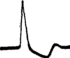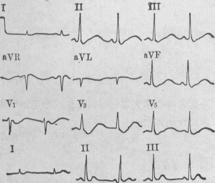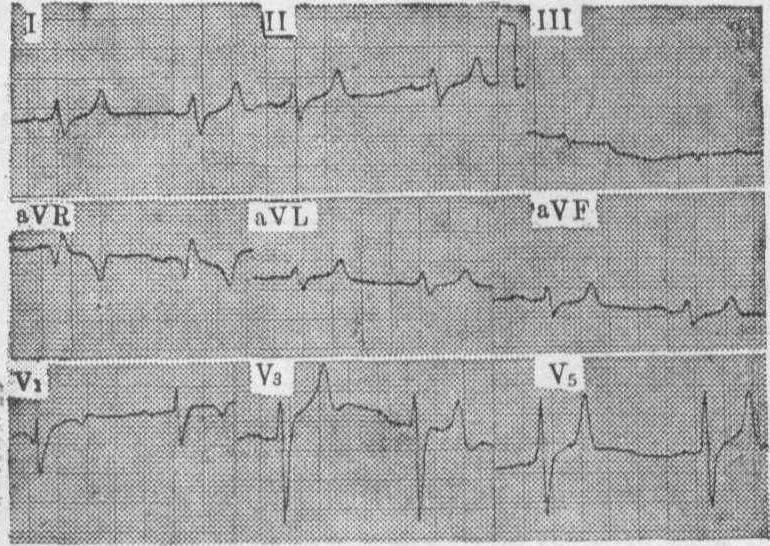 图2 血钾过低心电图(血钾2.3mEg/L)末行心电图已恢复 血钙过高 主要改变为S-T段缩短或消失,Q-T间期缩短,其程度与血清钙浓度成反比。血钙进一步增高时T波增宽,Q-T间期可转为正常或延长,但S-T段仍然缩短;有时也可出现U波增高和T波低平或倒置,P-R轻度延长,偶而可发生二度或三度房室传导阻滞。快速静脉注射钙剂时(尤其是已洋地黄化的病人),可发生室性早搏、阵发性室性心动过速、窦性静止、窦房传导阻滞、甚至猝死。 血钙过低 主要改变为S-T段延长,Q-T间期延长,直立T波变窄、低平或倒置,但很少发生心律失常。 药物影响常见的为洋地黄、奎尼丁等药物可直接或间接地通过神经体液作用于心肌,使心电图发生改变,这些改变与药物的种类、用量、给药途径与速度、心肌有无病变、个体敏感性、体内电解质浓度及植物神经功能状态等有关,心电图在一定程度上可反映这些改变,作为是否属于药物的效应或中毒的依据之一。 洋地黄类制剂 洋地黄类制剂对心电图的影响有二: ❶应用洋地黄治疗剂量后,由于改善了心肌的代谢,使心肌的复极过程加速,因此可引起ST-T改变及Q-T间期缩短等。ST-T改变包括S-T段呈下垂型压低,T波低平、双相或倒置。双相T波往往是初始部分倒置,终末部分直立变窄,ST-T呈“鱼钩型”。上述心电图改变出现与否、程度的轻重与洋地黄剂量并无密切关系,而只是已经接受洋地黄治疗的标志即所谓洋地黄效应; ❷通过直接或间接的作用,洋地黄可使心脏的自律性、兴奋性和传导性发生改变,三者互有联系,并且在心脏的不同部位其影响的程度不尽相同,有时甚至完全相反。因此在洋地黄过量或中毒时,几乎可以产生所有类型的心律失常,常见的有P-R间期延长、二度或三度房室传导阻滞、窦房传导阻滞或窦性静止,频发性(二联或三联律)及多源性室性早搏,阵发性室性心动过速(特别是双向性或双重性心动过速),非阵发性房室交接处性心动过速伴房室脱节,阵发性房性心动过速伴不同比例的房室传导阻滞,心房扑动、颤动,严重者可发生心室颤动。