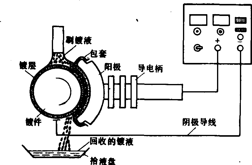 刷镀工作原理示意图 特种电镀 主要有非金属材料电镀、复合电镀和脉冲电镀等。 非金属材料电镀 指在非金属材料制品上进行的电镀。它扩大了电镀技术的应用范围,可使各种非金属制品通过在其表面镀上一金属层,达到提高原制品的使用性能和其他一些特性的目的。例如,在硬塑料制品表面上电镀金属层,使塑料制品具有金属光泽,能导电、导磁和钎焊,实现“以塑代钢”,并减轻制品重量,节约金属材料和能源消耗,降低成本等。 复合电镀 在镀液中加入某些化学惰性微粒物质,搅拌使微粒均匀悬浮于镀液中,通电后,微粒与金属共沉积于阴极表面,形成金属基质中弥散着微粒的复合镀层。复合电镀的工艺过程与常规镀槽电镀大致相同。 脉冲电镀 利用脉冲电流进行电镀。脉冲电流使电极反应出现间歇性质,在规定的时间接通和切断电路,电流接通时间与切断时间之比值称为功能周期或有效周期,是脉冲电镀的重要工艺参数之一。脉冲电镀均镀和深镀能力强,获得的镀层密度高、孔隙少、平整性好,已在电子工业和轻工业得到应用,并向其它领域扩展。 电镀技术electroplating technology借助电化学的方法,在金属或非金属制品表面获得金属覆盖层的工艺技术。即将金属或非金属(塑料等)零件作为阴极,以可熔性或不溶性材料为阳极,同时浸入金属盐的溶液中,通以直流电流,使金属沉积到零件表面的工艺。电镀广泛应用于抗磨、抗蚀、装饰及特殊用途的领域,是修复零件的有效方法。在机械维修中最常见的有镀铬、镀铜、镀镍、镀铁及复合镀等。主要设备是低压直流电源、镀槽及通风换气装置等。 |