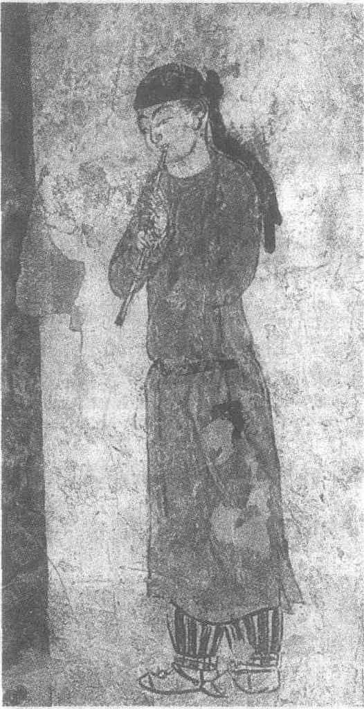 唐总章元年(公元668年)。纵185厘米,横92厘米。陕西省西安市南郊羊头镇李爽墓墓室东壁壁画。1956年发掘。图中男侍戴黑色幞头,着圆领红色袍,露黑条纹长裤,站立吹箫。他的面庞圆润秀美,五官如同女性般纤丽。头略侧,双目微下视,目光中隐含幽怨,似沉浸在自己所演奏的悲凉曲调中。笔触婉转曲折,运用自如,人物刻画十分传神。