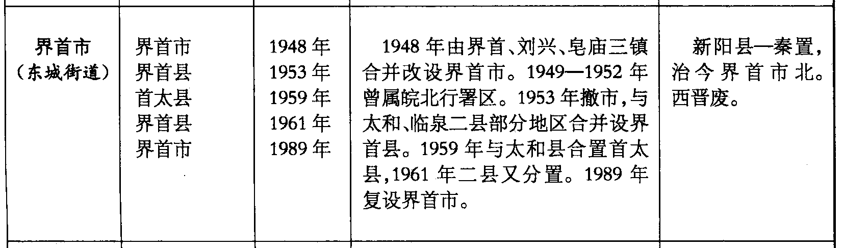 界首市(东城街道)界首市界首县首太县界首县界首市1948年1953年1959年1961年1989年1948年由界首、刘兴、皂庙三镇合并改设界首市。1949—1952年曾属皖北行署区。1953年撤市,与太和、临泉二县部分地区合并设界首县。1959年与太和县合置首太县,1961年二县又分置。1989年复设界首市。新阳县—秦置,治今界首市北。西晋废。