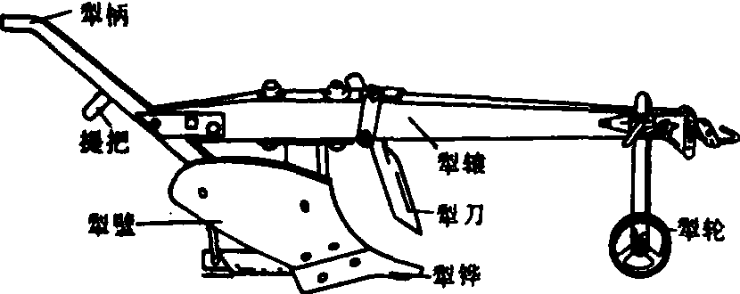 图1 前架式犁 牲畜在前面牵引,耕者在后面手扶犁把跟着步行耕地的犁称为步犁(图2);犁上装有轮子,人能坐在犁上的称为乘犁或车犁。