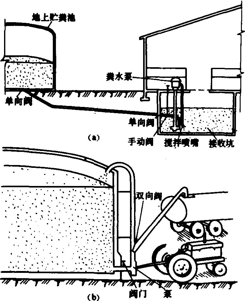 注:排粪量、挥发性固体排量和总固体排量是每1000千克畜禽体重的每天排量 处理畜禽粪便的方法主要有:❶生物处理法。是利用细菌分解来减少处理后畜禽粪液的BOD5,从而减少粪便对环境的污染。 ❷物理处理法。对粪便进行固液分离和干燥,以改变粪便的物理性质。 ❸化学处理法。利用化学药剂对粪便进行净化和消毒。此外,根据对畜禽粪便处理的完全性程度又可分为不完全处理法和完全处理法。不完全处理指处理后的产品未能完全净化,用于一般的农牧场。完全处理是处理后产品得到完全的净化,适用于无农田的集约化饲养场。 处理目的 主要有: ❶农田的施肥不能常年进行而有一定的时间性,经常需要进行贮存后施入农田; ❷有的农田靠近水源、鱼塘或居民区,必须将畜禽粪便的污染性(BOD5)降低后施入农田; ❸畜禽粪便含有一定的营养物质,可以将其处理后掺入其他饲料进行喂饲; ❹将畜禽粪便的液、固部分分别处理成冲洗水和垫草代用品来循环使用; ❺将畜禽粪便进行处理后生产沼气,或高温分解成燃油,以作为能量来源; ❻无农田的集约化饲养场需要对畜禽粪便进行完全处理,以免污染公共环境。目前,处理成肥料仍是主要的方式,作为饲料和能源的粪便处理所占比例还很小。 处理设备类型 有堆肥设备、贮粪设备、化粪池、氧化沟、沼气发生设备、干燥设备、机械分离设备、多级生物处理设备等。 堆肥设备 将畜禽粪便和植物茎秆等有机物进行堆积,经细菌的作用使有机物分解为稳定的有用物质。根据堆内氧气情况,可分充气式和厌气式两种堆制方式。充气式堆肥又可分条堆式和封闭容器式。 条堆充气式堆肥设备包括堆肥场、运输设备和翻动设备。形成的堆肥呈高1.5~2米,宽2.5~4米的长条堆状,顶部可按休止角形成30°坡顶,多雨气候下应成半圆顶或盖顶棚防雨。每2~3天翻动一次,以充入空气保证好气性细菌的活动。堆积可用装载机进行,翻动可采用装载机或专用的倒粪机。倒粪机是装有带齿滚筒的跨在肥堆上的自走式机器,在向前移动的同时将条堆翻转混合。堆肥的最佳参数为: 有机物碳氮比26:1~35:1,含水率50~60%,堆内温度38~55℃。整个堆肥时间约需6周,产品无臭味。 封闭容器充气式堆肥设备是一种带搅拌装置和强制通气装置的密闭容器,畜禽粪便在容器内由搅拌装置定期搅拌(每隔30分钟运转10分钟)并用风机通气,由好气性细菌分解为稳定物质,堆肥时间10~15天。这种设备机械化程度高,但投资和能量消耗都大。 厌气式堆肥常堆成高2—3米,宽5~6米,长达50米的粪堆,不进行翻动,堆内温度较低,堆肥时间约需4~6月,堆肥过程中散发臭味,最终产品含水率较大,但氮损失较少。 现代的堆肥一般都为充气式。它生产出的已消灭虫卵和草籽的高效肥料和土壤改良剂,常用于温室土壤和需要进行土壤改良的农牧场。也用于需要将堆肥后产品渗入垫草循环使用的饲养场;干旱地区围栏饲养的大型肉牛场;厚垫草平养的鸡场;无农田而需将禽畜粪便作完全性处理的集约化饲养场等。 贮粪设备 畜禽粪在贮粪设备中贮存,并在合适的时间(秋收后和春播前)施入农田。按照粪便状态可分固态粪便贮存设备和液态粪便贮存设备两种。 固态粪便含干物质大于25%,其贮存设备包括坚硬水泥地面、堆积墙和装载机。往往用于加垫草的拴养牛舍。堆粪地面向着墙有1:50的坡度,墙高1.5米左右,底部有排水缝隙,外部靠墙脚有排水沟,经排水管将粪内液体和雨水排入粪水池。堆积和取粪可借助于装载机。 液态粪便含干物质在10%以下。其贮存设备有三种: ❶畜舍内地下粪坑。建立在猪舍或肉牛舍缝隙地板下,为混凝土结构,容量为5~12月(通常为半年)的排粪量,深在1.8米以下。设有通风设备。使用前应放入10~30厘米水。卸空前2~4小时应进行搅拌,一般利用专用立轴离心式粪水泵进行搅拌和卸空。 ❷室外敞开的地下贮存池。一般为土结构,侧边坡度1:2~1:3,如土质易渗透,可用就地融接的塑料薄膜衬里,也可以混凝土砌成。贮存期为1年以内。常用于散放隔栏饲养奶牛舍。用拖拉机前悬挂刮板将粪推入牛舍内端部接收坑,用离心式或柱塞式粪水泵及地下管道输入贮存池。搅拌和卸空与上同。周围应设1.5米高的围栏。 ❸室外地上贮粪池。一般由凹形板块联接而成,板块由搪瓷钢板、镀锌钢板、覆有环氧树脂的钢板或覆有玻璃层的钢板制成。一般由工厂成套生产,直径4.6~18米,高1.2~4.8米,容量19~1227米3。地上贮粪池及其附属设备如图1(a)。在畜禽舍的端部有接收坑,粪便由刮板送入接收坑,再由粪水泵通过地下管道和单向阀进入贮粪池。贮粪池另有一泵作搅拌和卸料用[图1(b)]。贮量按半年加20%余量考虑。由于设置方便,地上贮粪池在发达国家应用较多。 化粪池 用来使畜禽粪便稳定,降低其污染性,并起贮存作用。化粪池按照分解作用的类型可分充气式和厌气式两种。 充气式化粪池由好气性细菌对粪便进行分解,根据充气的方式它又可分自然充气式和机械充气式。自然充气式化粪池深度较浅,在1.2米以下,由水表面自然通气或水面藻类植物光合作用提供氧气。当利用藻类植物提供氧气时最佳温度为20~35℃。它不需动力,但占地面积大,每1 000千克活重畜禽需310~720米2。机械充气式化粪池深度为2~5米,利用充气机将空气充入化粪池,充气机有旋转涡轮式和压气式等。机械充气式化粪池的BOD5降低率可达80