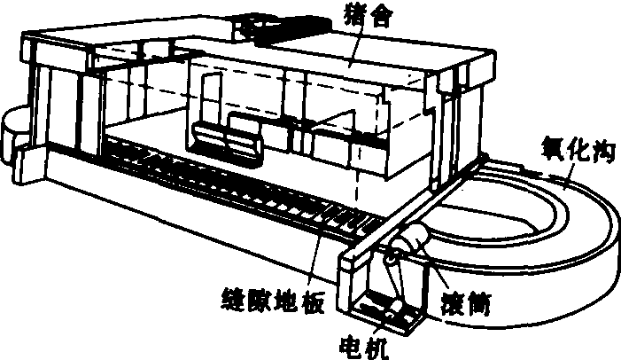 图1 地上贮粪池及其附属设备 厌气式化粪池不加任何搅动或充气,在分解的同时进行沉淀分离。除了上表面液体有少量好气性细菌分解外,大部分液体和沉淀的固体皆由厌气性细菌进行分解。整个过程中BOD5的降低率可达80%。厌气式化粪池不需要能量,可节省劳动力,所处理液体可以含较多的固体量,但其处理时间要求较长,要求化粪池容量大(约为机械充气式化粪池容量的1倍)。冬季分解作用差,经过严冬后春季有臭味。厌气式化粪池有时和充气式化粪池联合使用,BOD5降低率可达97%。 化粪池常为土结构,池边坡度比为1:2,堤岸应有2.5~3.0米宽,以便于厩液施洒机进入。化粪池底应为粘土,为了防止渗透也可用塑料薄膜或丁基橡胶衬里。中部应有拖拉机通向底部的硬质坡道,以便定期清除沉淀的淤泥。化粪池开始使用时应加入1/3~1/2全容量的水,最好春季开始工作,逐渐均匀加入粪便。蒸发量过大时应加水稀释,液体部分每年在秋收后和早春洒入田间。沉淀的淤泥一般2~3年清理一次,有的可6~7年清理一次,清理的淤泥可施入田间耕入底层。 氧化沟 一种充气式生物处理设备,由好气性细菌进行粪便的分解。它是一个长形环状沟,沟的端部安有旋转滚筒,滚筒浸人液面7~10厘米。由滚筒的旋转提供氧气,并带动整个液态粪以0.3米/秒的速度旋转,使固体部分悬浮、混合,加速好气性细菌的分解作用。在畜牧场,氧化沟经常建在猪舍、牛舍和鸡舍的下方,以代替粪坑(图2)。处理后的粪便BOD5降低率达90%,无臭味,可改善畜禽舍环境;沟深较浅(常为1米以内),容易在畜舍下建造;处理效率高(滞留时间小于3周);要求的容量小(每1000千克活重畜禽仅需1.3~8.5米3)。但它的能量消耗大。