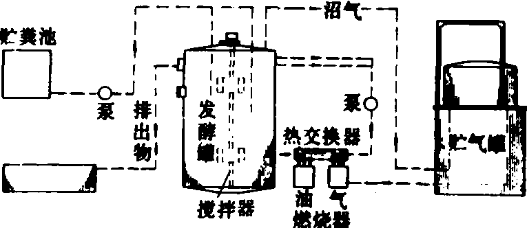 图2 猪舍局部缝隙地板下的氧化沟 沼气发生设备 利用受控制的厌气性细菌将有机物(碳水化合物、蛋白质、脂肪)分解转化为简单有机酸和酒精,然后再转化为沼气和二氧化碳。生产沼气的设备组合如图3。 发酵罐是一个密闭的容器,为砖或钢筋混凝土结构。有粪液输入和输出管道,罐外设有热交换器对粪液进行加热以提高发酵效率。罐中有搅拌器,进行搅拌以使粪液温度均匀,有利于有机物的分解。产生的沼气引入贮气罐。贮气罐有上下浮动的顶盖,以保持沼气有一定的压力。在正常条件下,每1 000千克活重畜禽每天的粪便可产生沼气2.6~6.2米3。