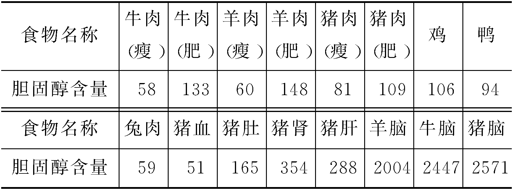 | 释义 | 畜禽肉的脂类含量畜禽肉脂肪熔点较低(33~40℃),其不饱和脂肪酸(亚油酸)占脂肪酸含量的20%。脂肪含量,鸡肉约占9.4%,水禽约占15%,鸭为19.7%。兔肉脂肪含量仅为0.4%,兔肉蛋白质含量为21.2%,是典型的高蛋白低脂肪食品。禽畜肉的脂类中,胆固醇含量有明显的差异,详见下表(mg/100g):