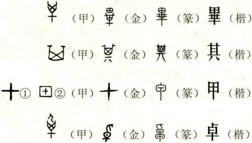 “其”甲骨文作“ ”,是甲骨文“ ”的本字,只是“ ”在參與組字時少了一些贅飾。“其”從凵,從乂會意。“凵”音坎,八卦中為水,置物為受器;“乂”(音義),是一個旋轉中的“十”,具運動變化之意❶。 “其”甲骨文時就用於: (1)表示疑問語氣的副詞,“其至于丁亥雨?” (2)第三人稱的代詞,“土方其敦乎。” (3)表示將要的助詞,“今日告其步于父丁一牛”等。 金文的“其”( ),給“ ”下增加少陽符號“⚎”,為意音字。 少陽,陰中之陽,為東方,為春木,為發生。 如果說“ ”是內因運動變化的根據的話,那麼“⚎”就是給“ ”增加運動變化的外因條件,“其”的以形表意的視覺符號大概就是這樣完滿的。小篆作“ ”,給“ ”增畫不說,將少陽符號轉換為“丌”(ㄐ丨 )仍為意音字。楷書作“其”。“其”的本意是: (1)具體意義上,使得置物起到變化的器具; (2)抽象意義上,弘旨一切變化著的動態事物。 (3)其是世間一切事物的善變之端。其所指的廣泛性,真有點“本是大籮筐,事事都能裝”的味道。 正因為它在抽象意義上所指的廣泛性,它的用武之地多在文字表意的詞語上: 音歧(ㄑ) (1)代詞。《詩經·周南·桃夭》:“桃之夭夭,灼灼其華;之子于歸,宜其室家。” (2)連詞。韓愈《馬說》:“其真無馬邪?其真不知馬也!” (3)副詞。《中山狼傳》:“先生其此類乎?” (4)助詞。《詩經·邶風·北風》:“北風其涼,雨雪其雱。” 音吉(丩) (5)代詞後的助詞。《詩經·鄭風·羔裘》:“彼其之子,舍命不渝。” (6)疑問後的助詞。《詩經·小雅·庭燎》:“夜如何其?夜未央。” (7)地名人名。 “其”還以其本意異構了許多漢字: 箕:從竹。竹製簸穀之“其”(具)。 簸:從竹,從皮。竹製“其”,簸箕,簸去穀物糠皮的器具。 淇:從水。從淇山流出的水。黃河支流,在今河南北部。 琪:從玉。美玉,古詩云:“因知昭明前,剖石呈清琪。” 萁:從草。“其”指豆杆,曹植《七步詩》:“萁在釜下燃,豆在釜中泣。” 基:從土。土為“其”之本根。《詩經·小雅·南山有臺》:“樂只君子,邦家之基。” 綦:從糸。糸,生殖之脈系。指“其”的蹤跡。 倛:從人。“其”的擬人,特指醜惡的人,《淮南子·精神》:“視毛嬙西施,猶倛醜也。” 唭:從口。 “其”指口吃。 唭㘈,有聲而無辭。 娸:從女。“其”對女的醜化。詆娸,詆毀辱罵。 騏:從馬。“其”指如馬的獸,《司馬相如傳·子虛賦》:“乘遺風而射游騏”。 斯:從斤。斤具解析之義。對“其”的解構,也指“其”中的具體對象。 期:從月。月的朔望“其”為一期。《中庸》:“擇乎中庸,而不能期月守也。” 欺:從欠。欠具用力意。欠對“其”的輕負、騙詐、凌辱。 棋:從木。木製的弈具,《左傳·襄》二五年:“弈者舉棋不定,不勝其耦。” 祺:從示。指“其”的吉祥福澤,《詩經·大雅·行葦》:“壽考維祺,以介景福。” 旗:從。 指“其”迎風招展,飄揚張目。 蜞:從虫。虫名,“其”指水蛭。 麒:從鹿。“其”指像鹿一樣的祥瑞動物。 《說文》:“箕,簸也。 從竹,𠀠象形,下其丌也。 其,籀文箕。”許慎釋其,存在以下舛誤: (1)“箕”根本就不可能成為其的本字,箕是金文,怎麼可能作甲骨文“其”的本字? (2)甲骨文時代的“其”已經用作副詞、助詞、代詞,絲毫沒有用作“箕”的意思,同時那個時候是否有簸箕這樣的農用工具也很難說。據傳農用簸箕是戰國人孫臏創製的,故簸箕行尊孫臏為祖師。 (3)如果說“其”是具體實物的“箕”,上述以“其”所構形的漢字就無從說起。 (4)“𠀠”即“ ”也非象形字,它和凶、囟等的造字是一個系列,為了在書寫上避免相互混淆,才做增畫繁漸的處理,它是地地道道的會意字。甲,甲骨文一期作“十”,二至五期作“ ”。甲骨文❶的“甲”(十)是兩個陽爻的交叉,或者是太陽符號“⚌”的轉換。 後來為了與甲骨文“ ”(七)相區別,增畫作“ ”的。 到金文時“甲”又恢復甲骨文二至五期的形狀。小篆時的“甲”作“甲”是巽卦符號“☴”的轉換,是陰(∧)與陽(丅)交合之狀。“巽”為春夏,位東南,為風木。“甲”是一個發生生長的符號,故十天干中甲乙為木。 “ ”楷書訛作“甲”。甲,殷墟卜辭用作十天干之一第一位,“甲午貞強又歲祖乙。”也用作殷先公王及先妣之廟號,“貞大甲賓于咸。” 甲,郭沫若謂魚鱗之象形(《甲骨文字研究·釋干支》),林義光《文源》曰:“按古作十,不象人頭,甲者皮開裂也,十象其裂文。”《說文》釋“東方之孟,陽氣萌動,從木戴孚甲之象。一曰人頭宜為甲,甲象人頭”,除“東方之孟,陽氣萌動”接近釋義外,其實郭、林、許三位的析形,都是墮入“象形”泥沼的不可自拔。 “十”兩個“一”的相交叉,哲學上是宇宙的標意,豎畫代表時間,橫畫代表空間,“一”萬物之始。“東方之孟,陽氣萌動”,是說十天干中甲乙為木,甲為陽木,故為孟;木在東方,為少陽,代表興起,故謂萌動。《史記·律書》:“甲者,言萬物剖符甲而出也。”《太玄·戾》:“卵之始化謂之孚,草之萌甲亦曰孚,然則孚者物之始化也。”總而言之,“甲”具萌動、興起、孵化和萬物之始的蘊意。 甲,還異構了許多漢字,凡以“甲”所組構的漢字,都具有對“甲”的珍惜、關愛、護佑和對“甲”本意的延伸: 匣:從匚(ㄈㄤ)。匚是貯放物品(財富)的器具。“甲”被藏於匚器之中。俗語:“男人是個笆笆,女人是個匣匣;不怕笆笆沒齒兒,單怕匣